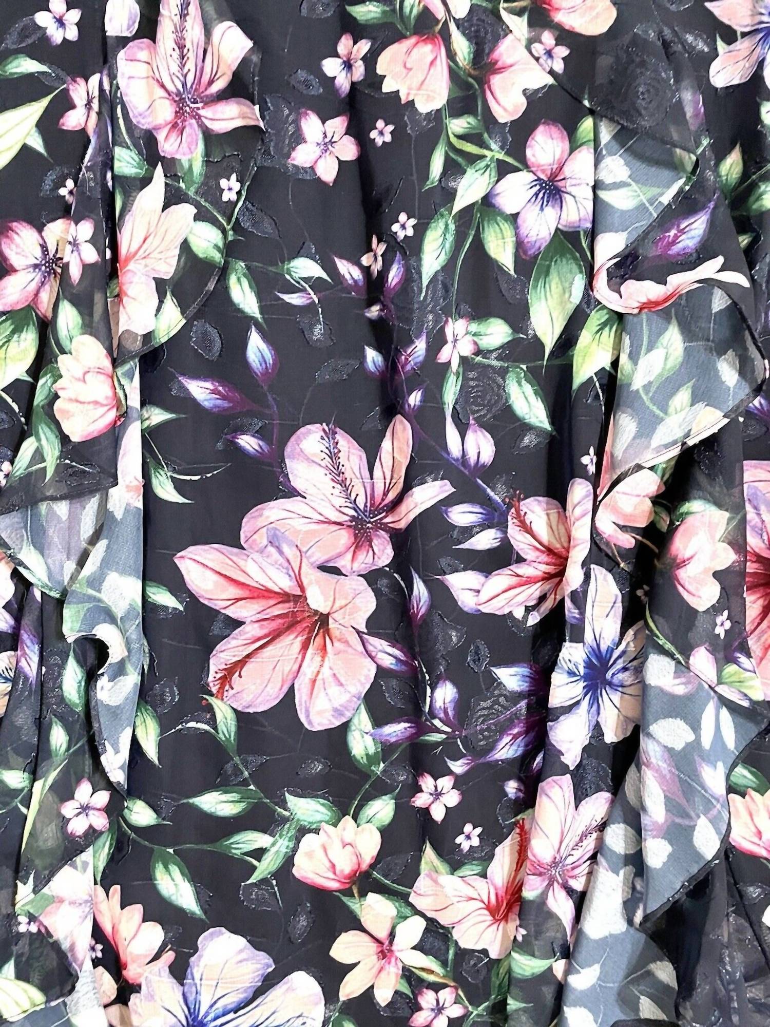 Introducing the Floral Sleeveless Printed Chiffon Gown by Marchesa, a stunning choice for evening elegance. This maxi-length gown captivates with its floral burnout chiffon and intricate ruffle detailing, accentuated by flutter short sleeves and a flattering V-neck. Made from 100% polyester with a discreet hidden back zip closure, it boasts a length of 62", shoulder width of 12", chest measurement of 17.5", and waist size of 13.5". For care, dry clean only.