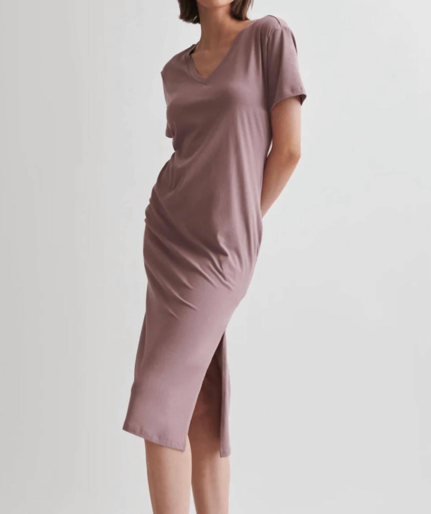 Introducing the Chana V-neck Sleepshirt by Skin, a versatile addition to your nightwear in a charming mauve shade. With a midi-length design and crafted from 100% organic Pima cotton jersey, this sleepshirt ensures ultimate comfort and softness. Featuring side slits, it effortlessly combines style with ease, making it perfect for lounging or layering with your favorite jacket. Care for this piece by following its specific instructions to maintain its luxurious feel and durability.