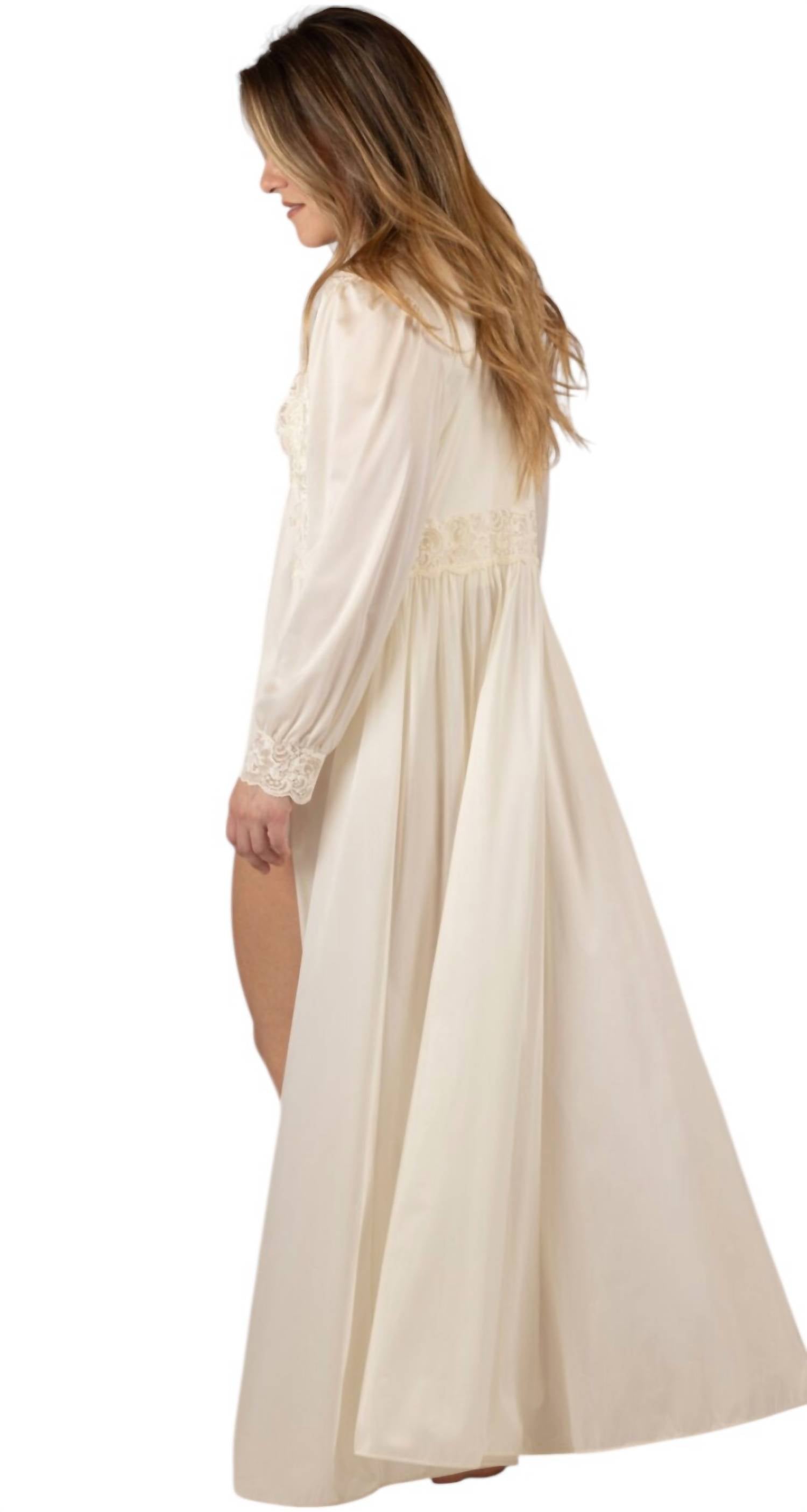 The Shadowline Lingerie Silhouette 54" Long Sleeve Long Coat in Ivory is crafted from luxurious 100% Nylon Tricot, providing a silky and soft touch. This nightgown, made in the USA and imported, features elegant long sleeves with lace cuffs and a lace-embellished bodice for a feminine fit. The garment is designed with a scalloped V-neckline and a flowing, gathered skirt for classic comfort and style. Closure is facilitated by three button loops at the front, and care is simple with machine washability.