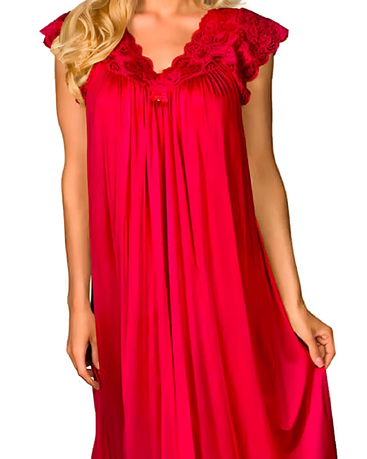 Experience the exquisite comfort of the Long Lace Cap Sleeve Nightgown by Shadowline Lingerie, designed in a captivating red hue. Featuring European stretch lace cap sleeves and a scalloped v-neck, this gown flows elegantly with a 53-inch nylon skirt. Accentuated by a delicate satin bow and pearl details at the center front, it perfectly combines style with feminine charm. Fabric is 100% Satintrique® Nylon Tricot for a soft, luxurious feel.