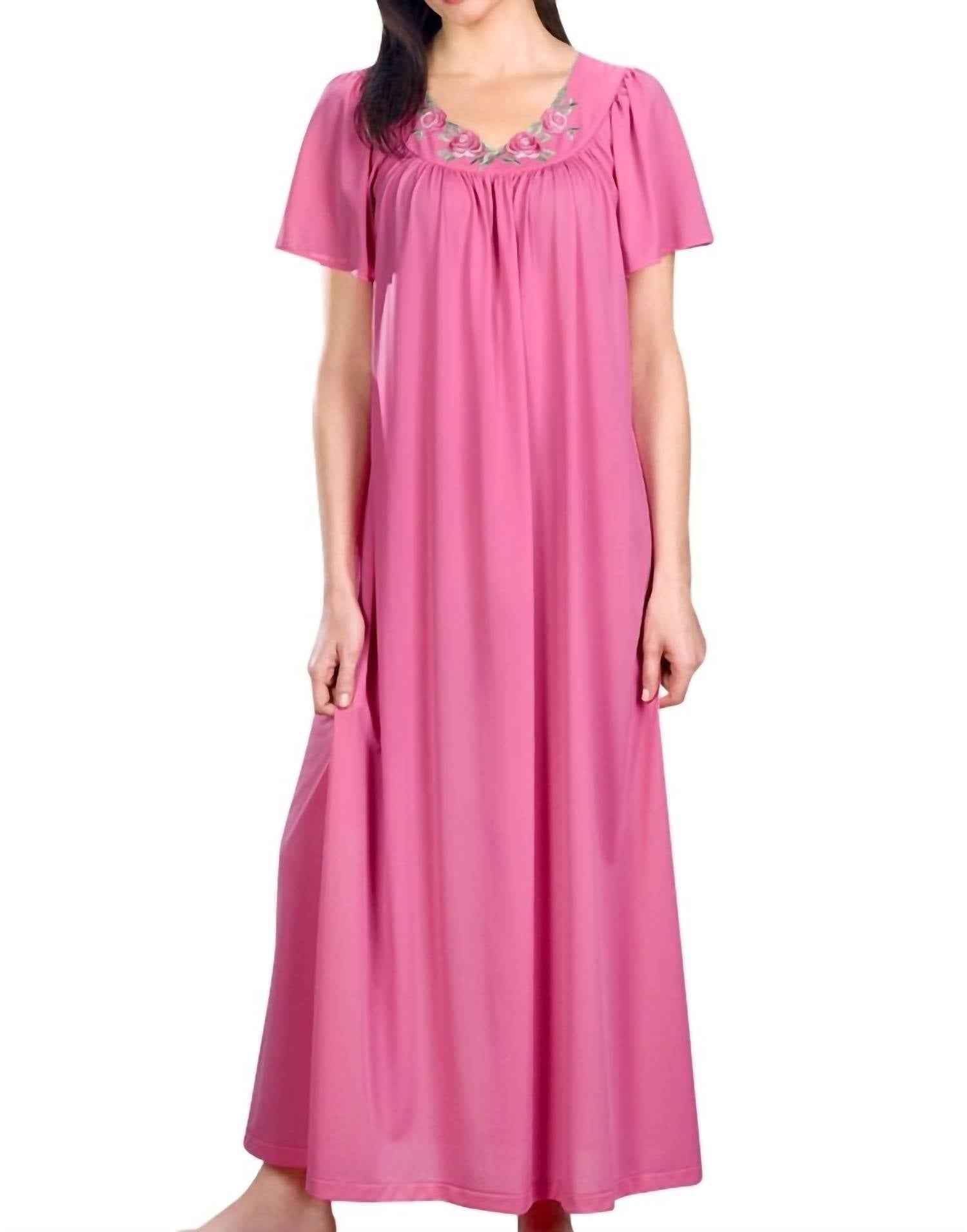 Introducing the Long Gown With Flower Petal Embroidery And Flutter Sleeves Nightgown by Shadowline Lingerie, a soft and silky addition to your sleepwear collection. This full-length nightgown features short flutter sleeves and is crafted from 100% Opacitrique nylon for a luxurious feel. The scalloped front yoke, embellished with elegant floral embroidery, adds a delicate feminine touch. Available in a variety of colors and sizes, this captivating piece in Rosey Pink ensures comfort and style.