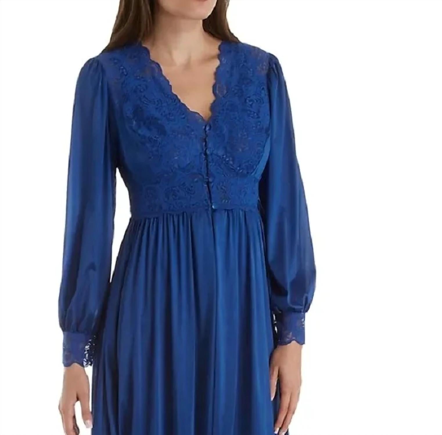 Indulge in the luxurious comfort of the Shadowline Lingerie Silhouette Long Sleeve Nightgown, a sophisticated piece crafted in Navy. This nightgown is made from 100% Nylon Tricot, featuring intricate lace-embellished bodice details, a scalloped V-neckline, and a gathered skirt for an elegant drape. Designed with lace cuffs and three button closures at the front, it offers a feminine fit with classic vintage styling. Made in the USA and imported, it's machine washable for easy care, making it perfect for home or travel.