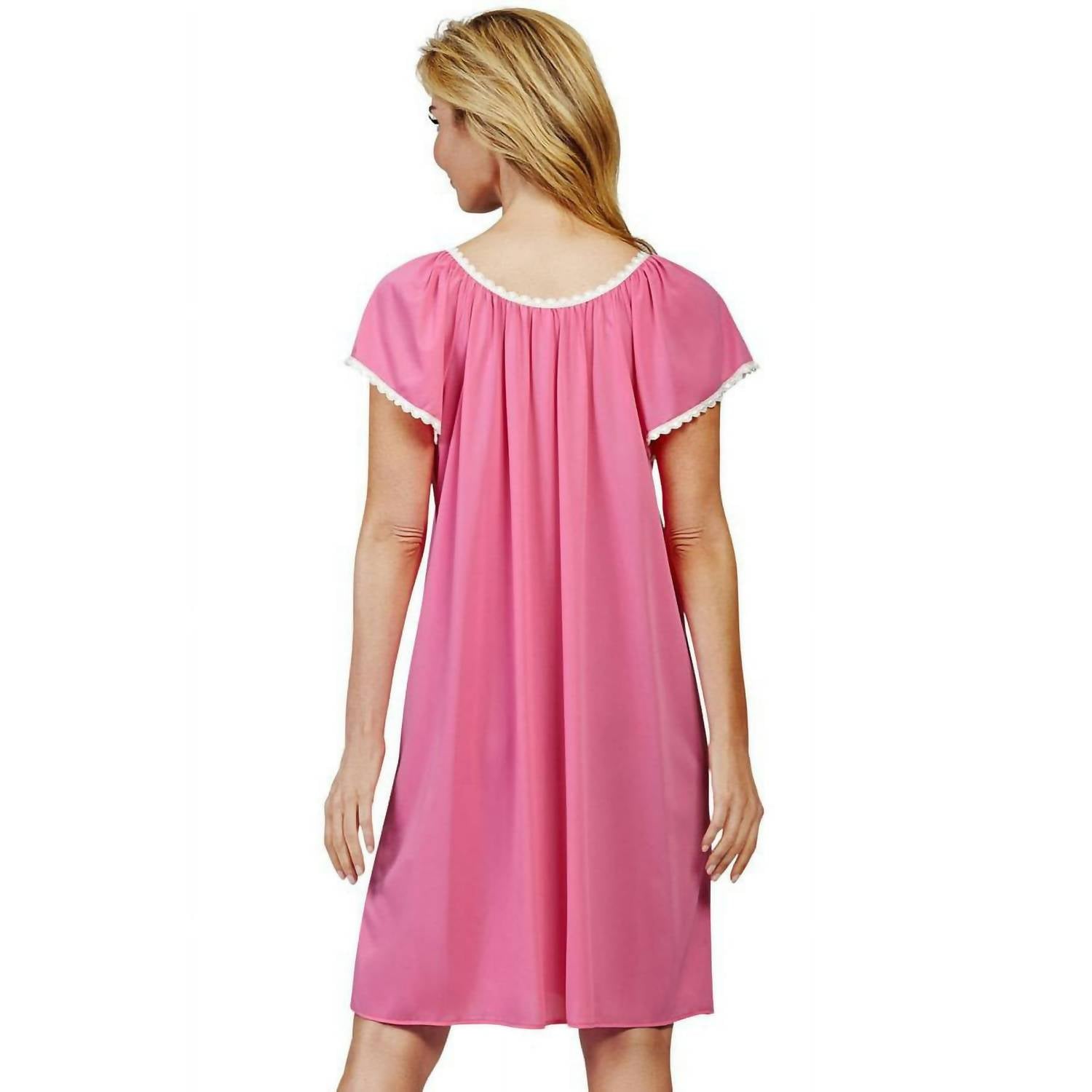 Embrace luxury with the Shadowline Lingerie Cameo Short Nightgown in Orchid. This nightgown features raglan sleeves and a lace-trimmed neckline for an elegant touch. Made from Opacitrique® nylon tricot, it offers modest coverage and softness, with a garment length measuring a total of 40 inches from shoulder to hem. Embroidery and fabric are proudly made in the USA, and this piece is easy to care for with a machine wash and tumble dry.