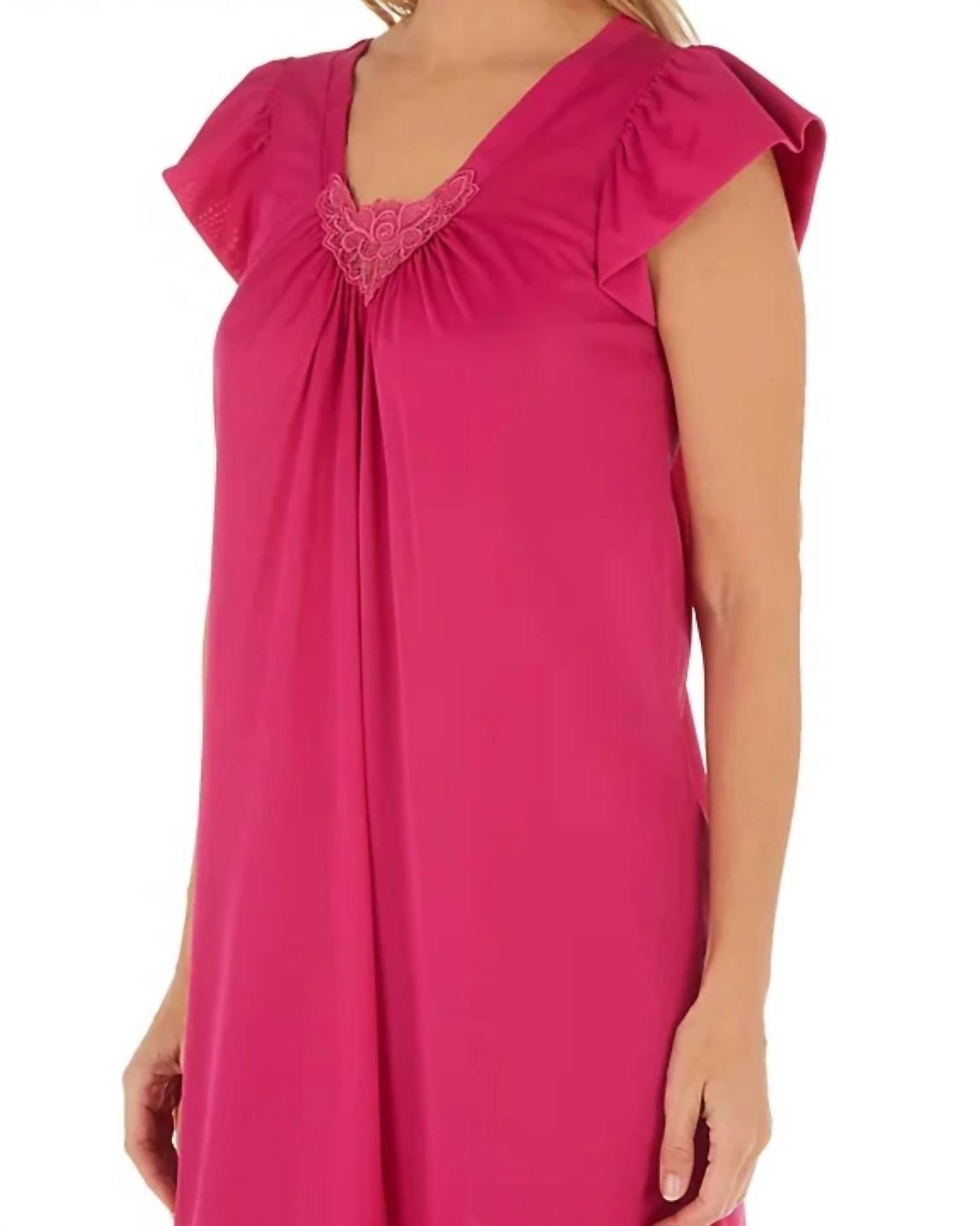 Introducing the Short Cap Sleeve Nightgown by Shadowline Lingerie, a chic addition to your sleepwear collection in vibrant raspberry. This nightgown is crafted from USA fabric using 100% Opacitrique Nylon Tricot for easy care and comfort. Its unique design features front and back V-necks and a stylish Venise embroidered medallion at the center front. Embrace contemporary style with classic comfort in this exquisite piece.