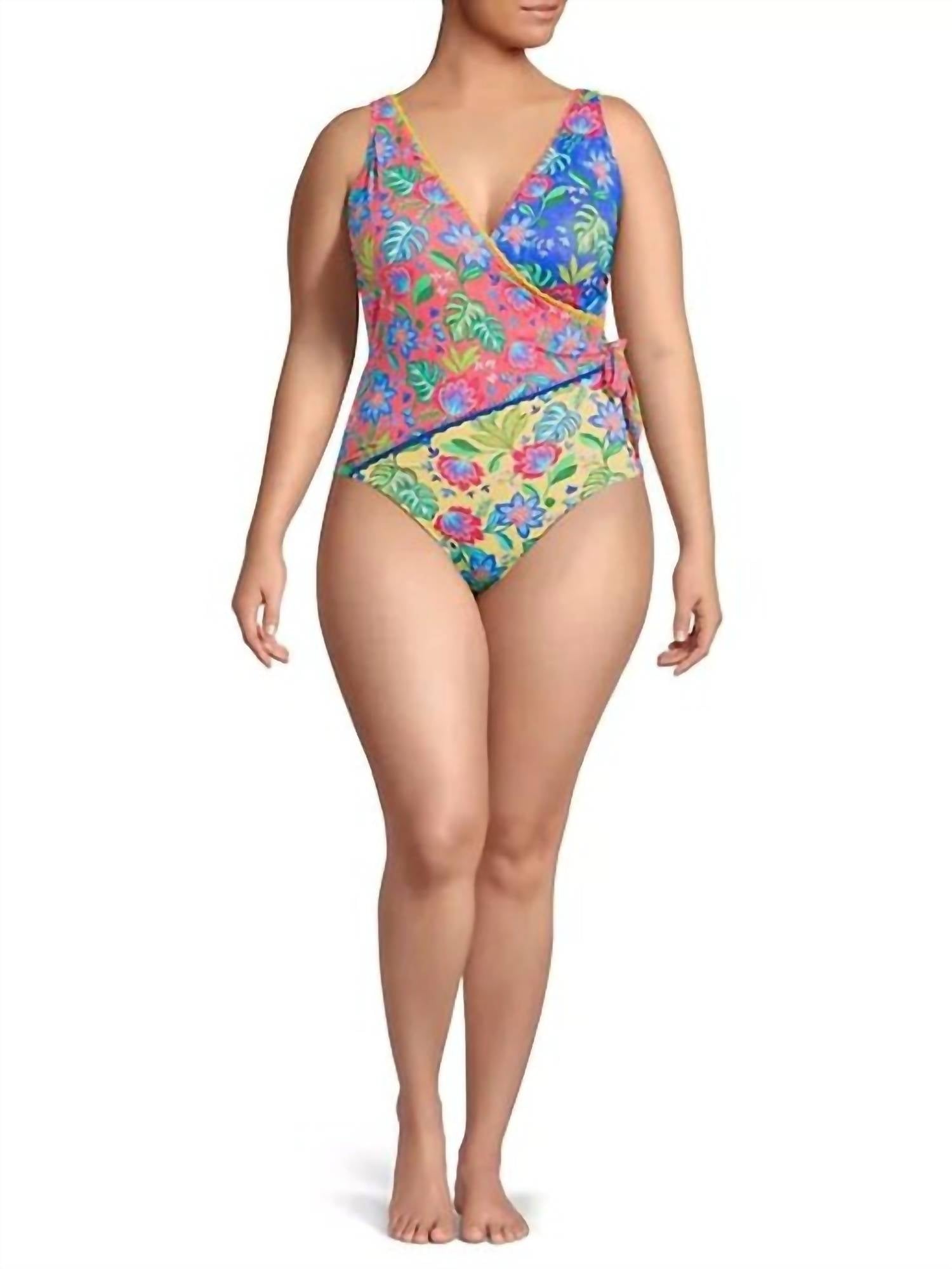 A one piece so chic you could even wear it as a bodysuit with your favorite pair of jeans. Step into summer with this vibrant and chic swimsuit, featuring a bold color-blocked floral print accented by crocheted trim and whipstitching along the neckline and front for a unique, eye-catching touch. Designed for both style and comfort, it includes a crossover neckline, adjustable shoulder straps, removable cups, and offers moderate back coverage.