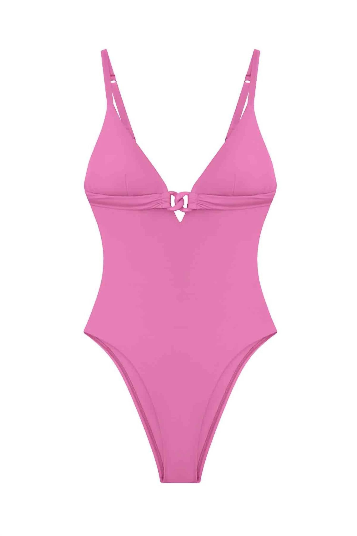 This Luxe Link One Piece Swimsuit is made from 80% recycled polyamide and 20% recycled elastane, featuring adjustable straps and bubblegum link chain details. Hand wash cold and dry flat to maintain its eco-friendly elegance.