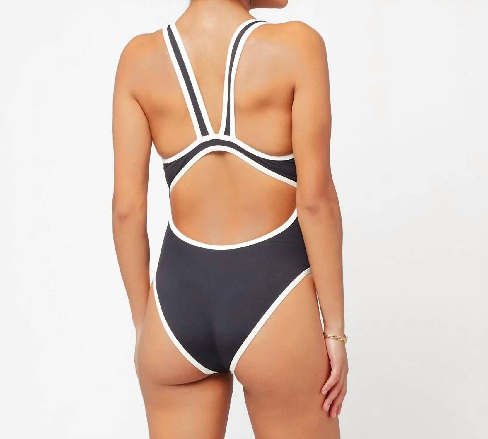 Designed to perfection and fit to flatter. You are going to love this one piece swimsuit. Introducing the Ebony One Piece Swimsuit by L*SPACE, designed for a sporty yet minimalistic beach day look. This swimsuit features a low scoop front neckline, complementing its high leg cut and low back with cutouts. Crafted from a blend of 97% nylon and 3% spandex, it offers a solid black and cream design with seam binding for a sleek finish. Care for this stylish piece by hand washing and laying it flat to dry.
