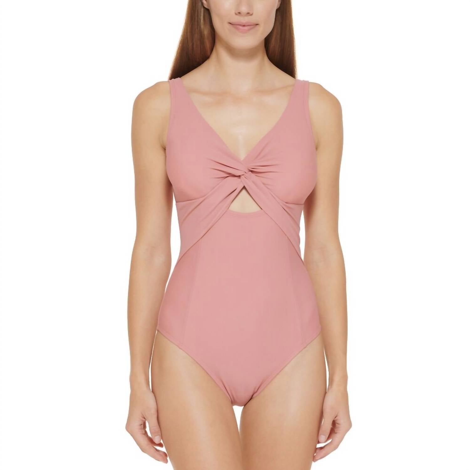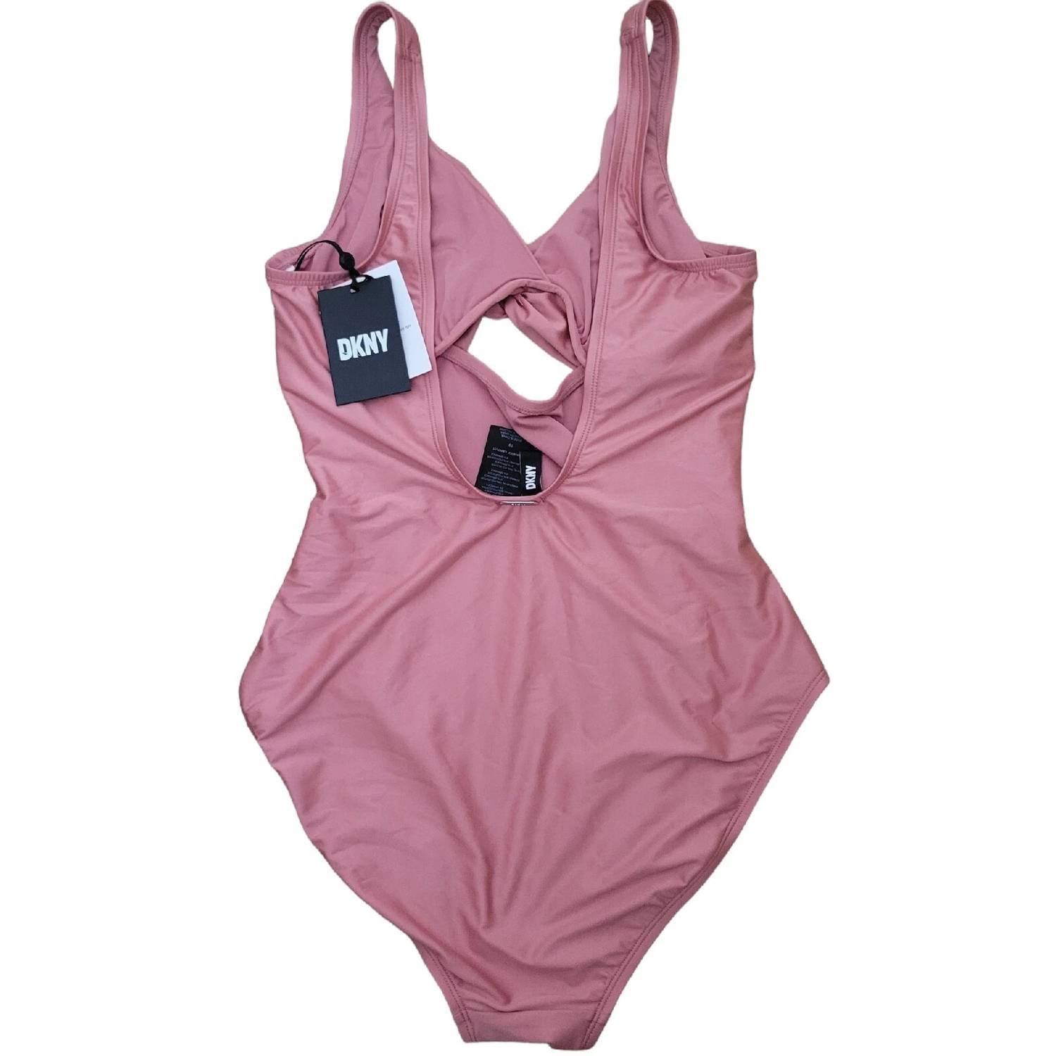 Designed to perfection and fit to flatter. You are going to love this one piece swimsuit. Introducing the Peek-a-boo Twist One Piece Swimsuit by DKNY, a chic choice for your beach day look in a soft pink hue. This women's one-piece features over-the-shoulder straps and a playful V-neck twist detail with a subtle cutout. Crafted from a polyester blend, this swimsuit offers moderate bottom coverage and removable soft push-up cups for added comfort. Care instructions recommend hand wash only.