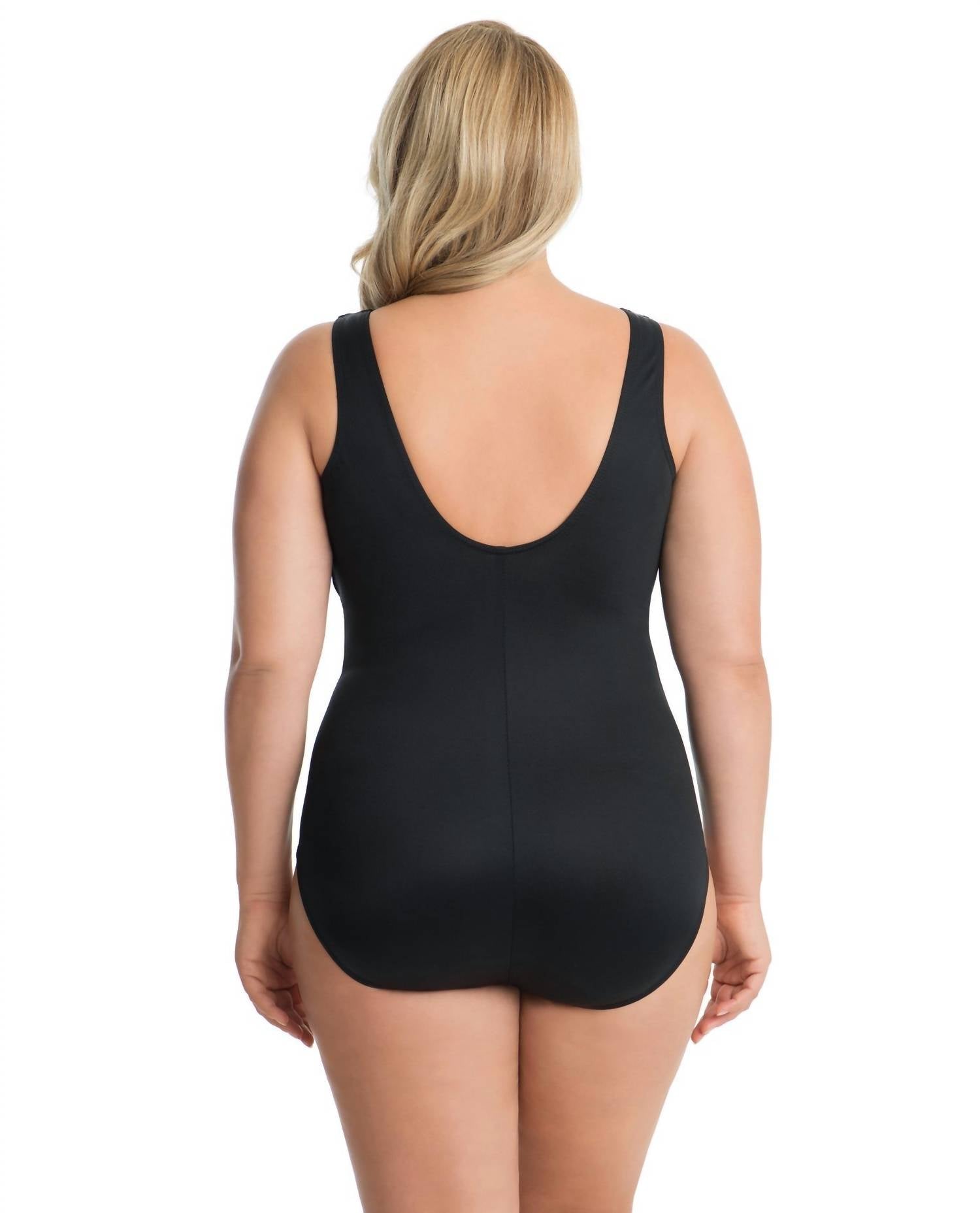 Experience the transformative power of the Miraclesuit Plus Size High Neck Palma One Piece Swimsuit, uniquely designed to help you look 10 lbs lighter in 10 seconds. This swimsuit features a high neckline and a shirred bodice to visually slim the torso, complemented by a fixed torso and a scoop back. Crafted from a comfortable blend of 69% Nylon and 31% Lycra Spandex, it includes a soft cup bra for superior bust support. The solid black design offers full coverage, making it a timeless addition to any swimwear collection.