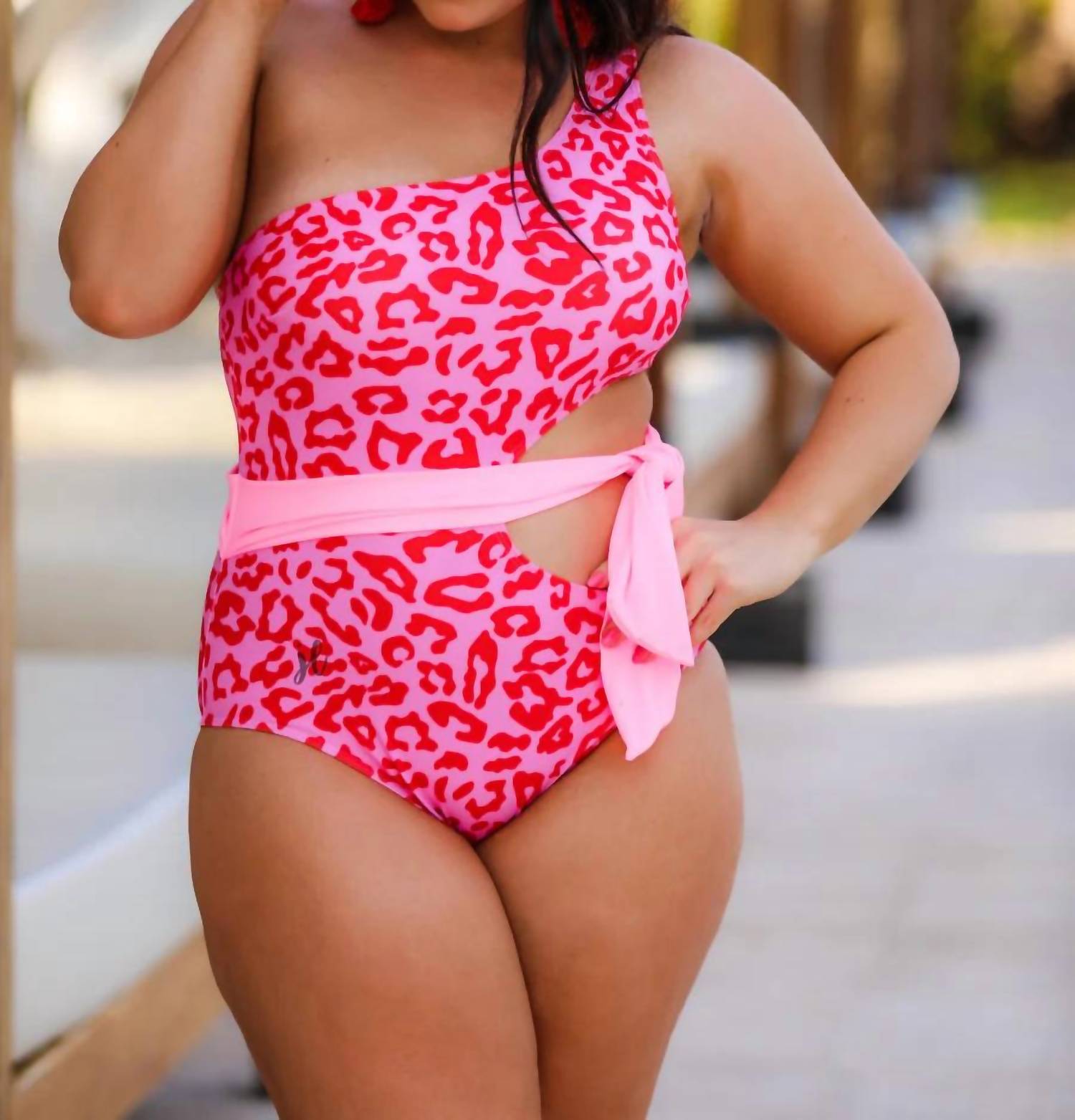 Designed to perfection and fit to flatter. You are going to love this one piece swimsuit. Unleash your wild side with the Sunkissed Leopard Swimsuit by Jess Lea, a striking one-piece crafted from 82% Polyamide and 18% Elasthane. This pink animal-patterned design features a chic one-shoulder neckline, a playful side cutout with a wrap-around tie, and removable padding for added convenience. With full coverage and stretchy material, it caters to a comfortable and stylish fit for summer adventures. Ideal for those with bustier or longer torsos, we recommend sizing up if in-between sizes.
