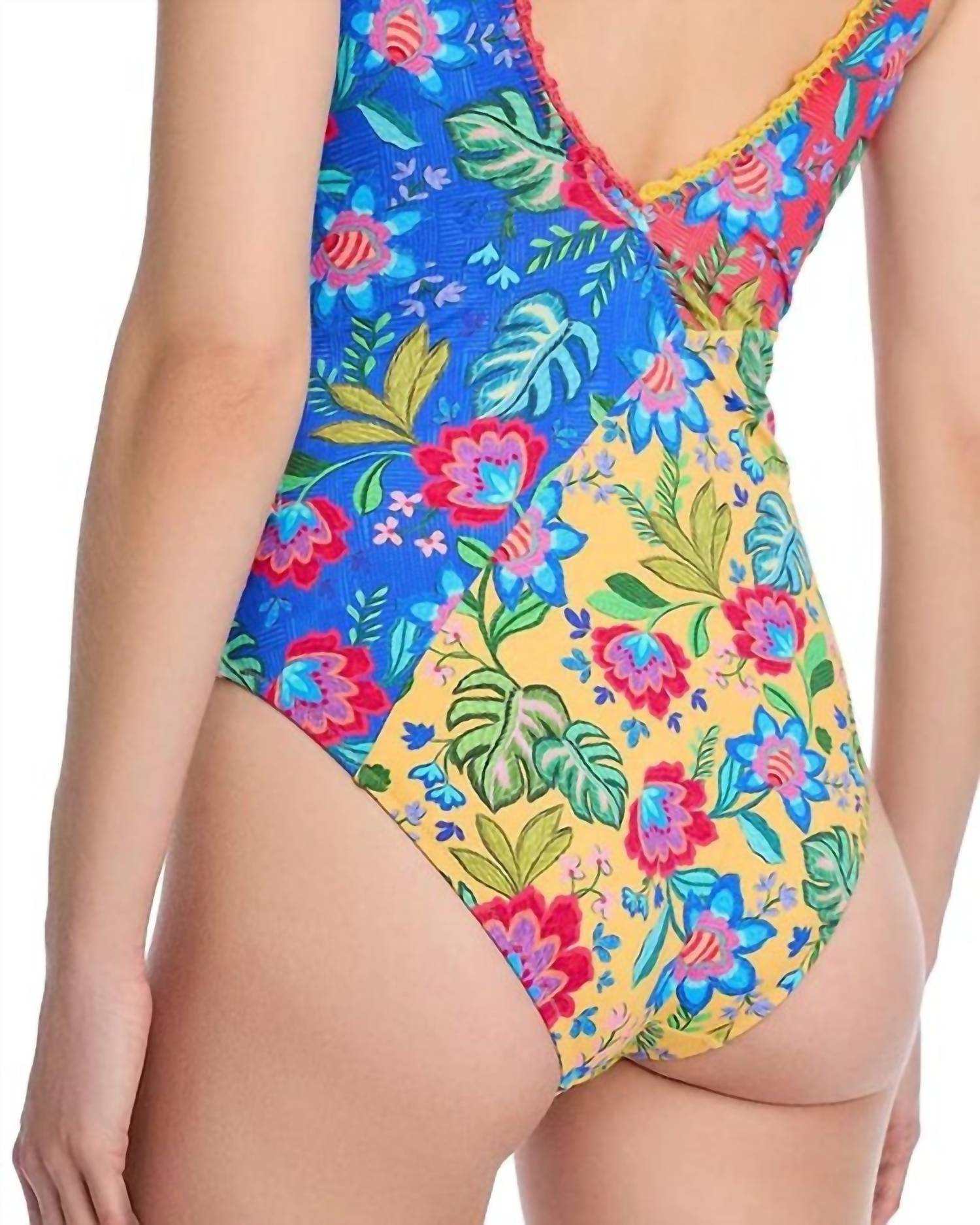 Designed to perfection and fit to flatter. You are going to love this one piece swimsuit. You’ll enjoy wearing this vibrant and stylish swimsuit! It features a color-blocked floral print with crocheted trim and whipstitching along the neck and front, making it a standout choice. The suit also includes a crossover neckline, adjustable shoulder straps, removable cups, and moderate back coverage.
