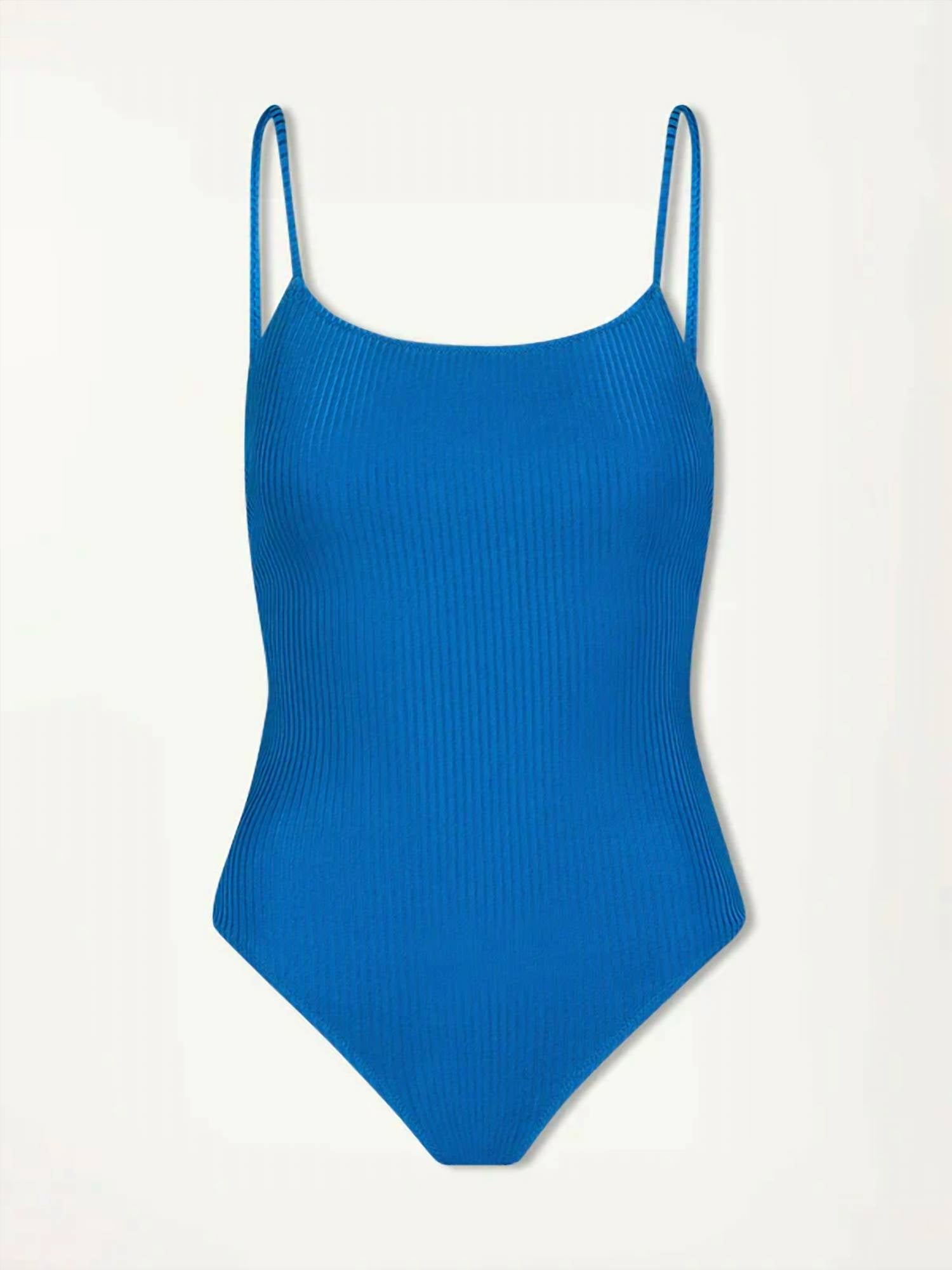 This one piece fits like a glove and covers all the right areas. Embodiment of style and comfort. Features adjustable spaghetti straps, a low back, and a wide scoop neckline, providing a classic coverage perfect for beach days. Crafted from a soft jacquard fabric with 92% Polyester and 22% Elastane, the swimsuit is lined with a silky Italian jersey for added comfort and UV protection, finished with an Econyl certified lining. Made in Morocco. Care for this piece by hand washing or opting for dry cleaning to maintain its integrity and style.