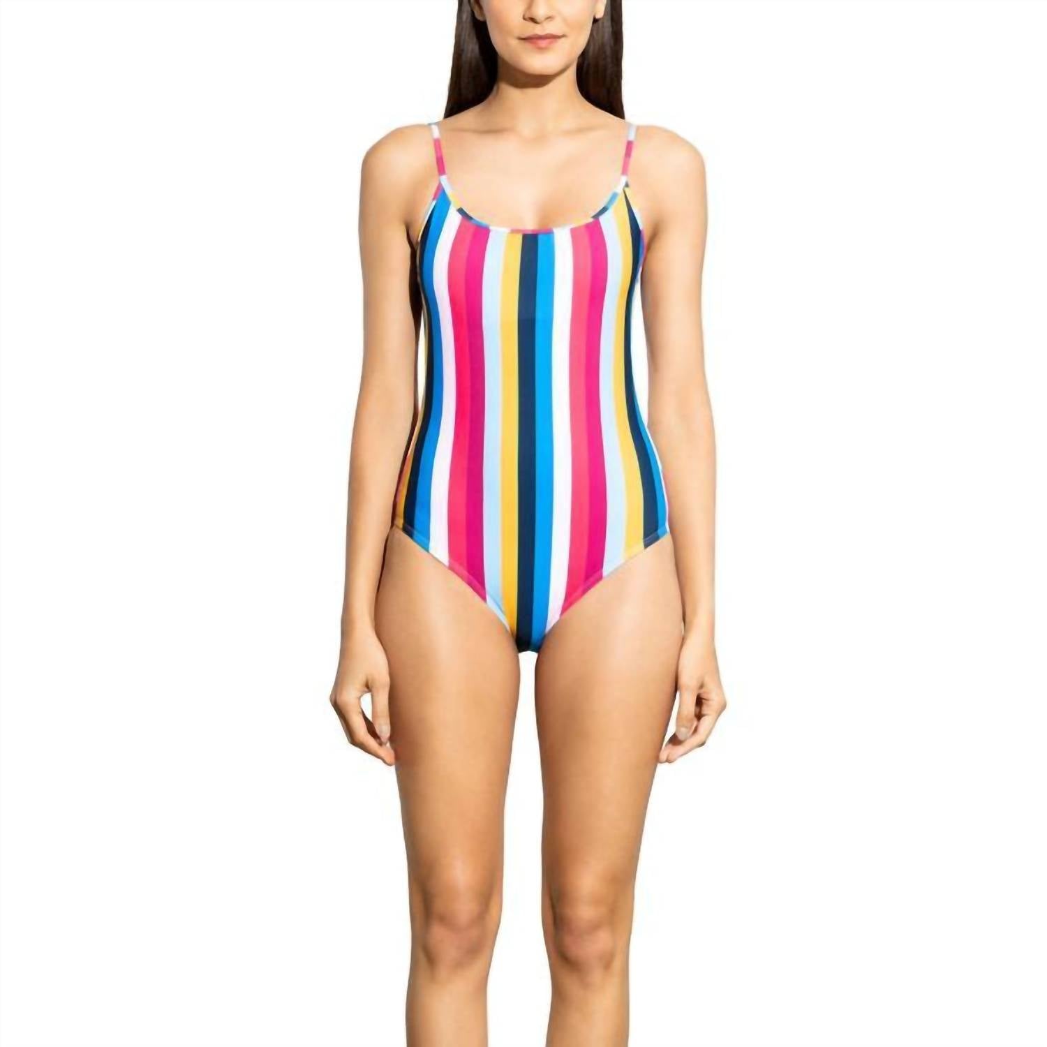 This one piece fits like a glove and covers all the right areas. This One-Piece is designed with a playful rainbow stripe print, offering an impeccable fit with adjustable straps and removable cups for customizable support. Made from a premium 80% Polyamide; 20% Elastane blend, it ensures comfort and freedom of movement, making it perfect for beach getaways or poolside lounging.