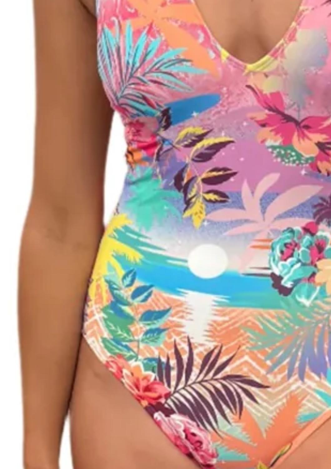 Introducing the Cross Back One Piece by Johnny Was, a vibrant addition to your swimwear collection in the striking Zeru color. This women's one-piece features a deep V-neckline adorned with floral blooms and contrasting straps that cross elegantly at the back. Crafted from 83% Nylon and 17% Elastane, this swimwear offers full coverage, with measurements for size Medium including a bust of 14 3/4", hip of 31 3/4", and a side seam length of 12 1/2". Care for it with a gentle hand wash in cold water, avoid twisting, and lay flat to dry.
