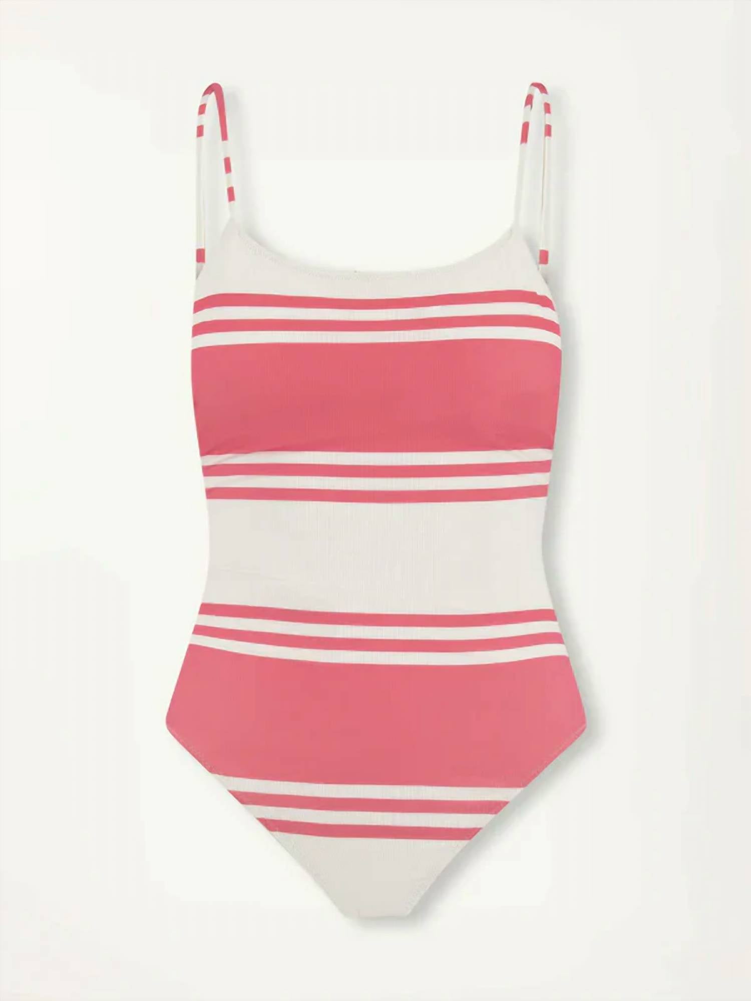 A one piece so chic you could even wear it as a bodysuit with your favorite pair of jeans. Embodiment of style and comfort. Features adjustable spaghetti straps, a low back, and a wide scoop neckline, providing a classic coverage perfect for beach days. Crafted from a soft jacquard fabric with 92% Polyester and 22% Elastane, the swimsuit is lined with a silky Italian jersey for added comfort and UV protection, finished with an Econyl certified lining. Made in Morocco. Care for this piece by hand washing or opting for dry cleaning to maintain its integrity and style.