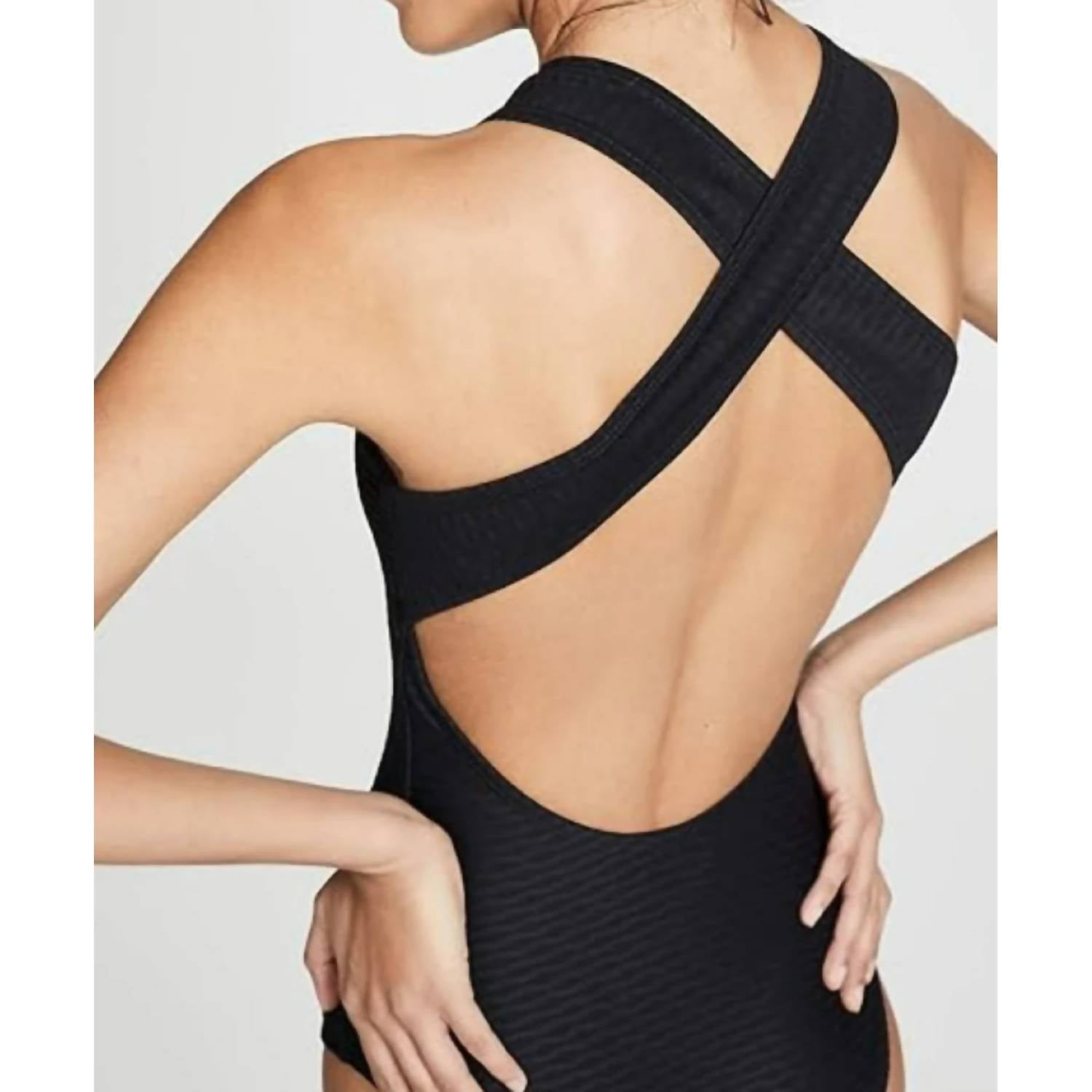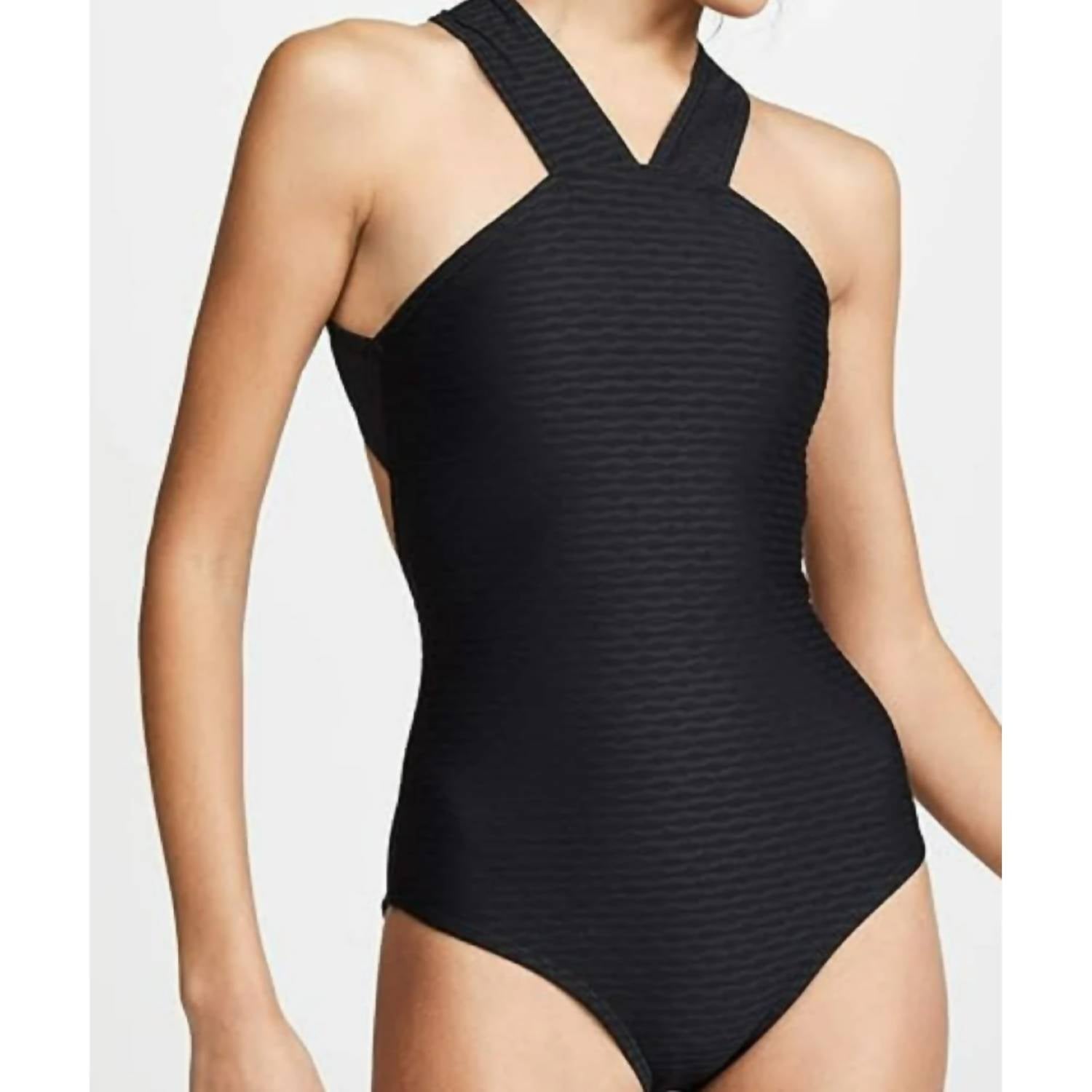 A one piece so chic you could even wear it as a bodysuit with your favorite pair of jeans. Introducing the Shoshanna Standard Tide High Neck One Piece Swimsuit in classic black, perfect for your next beach day. This minimalist swimsuit features high v-neck straps that crisscross at the back and cut-in shoulders, providing a sleek silhouette with full bottom coverage. The wave-textured finish adds a modern touch to this summer essential, crafted from a composition of 90% polyamide and 10% elastane, with a lining of 95% polyester and 5% spandex. Care for this lined piece by hand washing and line drying.