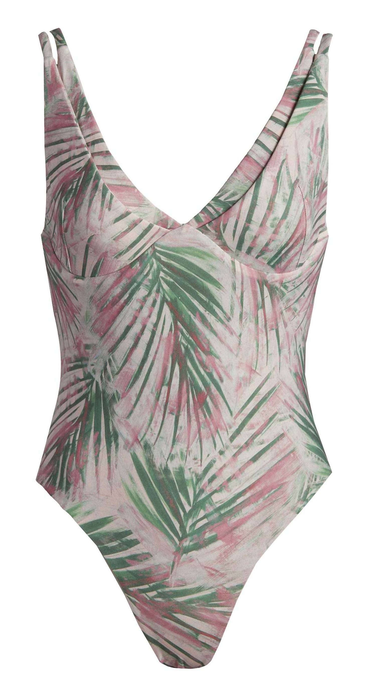 A one piece so chic you could even wear it as a bodysuit with your favorite pair of jeans. Indulge in the sophisticated charm of the LVHR Cassidy One Piece, featuring double adjustable shoulder straps and a high cut leg design for an effortlessly chic look. Crafted from 85% polyamide and 15% partially recycled spandex, this patterned palm print suit offers both style and sustainability. With its seamless finish, underwire support, and medium cheeky back cut, you’ll find the perfect blend of comfort and allure in this women's swimwear essential. Hand wash only; designed to fit true to size with 17" length from center front under bust to crotch seam. Model wears a size Small.