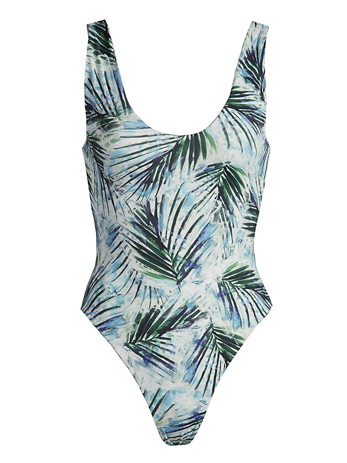A one piece so chic you could even wear it as a bodysuit with your favorite pair of jeans. Meet the Krissy One Piece by LVHR, a stunning choice for any sunny occasion. This patterned swimsuit in Blue Palm features a sexy scoop back and a high-cut leg designed to lift and flatter your silhouette with seamless construction. Made from a composition of 85% Polyamide and 15% Spandex, it provides double layer compression for a comfortable fit. Care for this medium coverage swimwear is simple with hand wash instructions recommended. Model is wearing a size small.