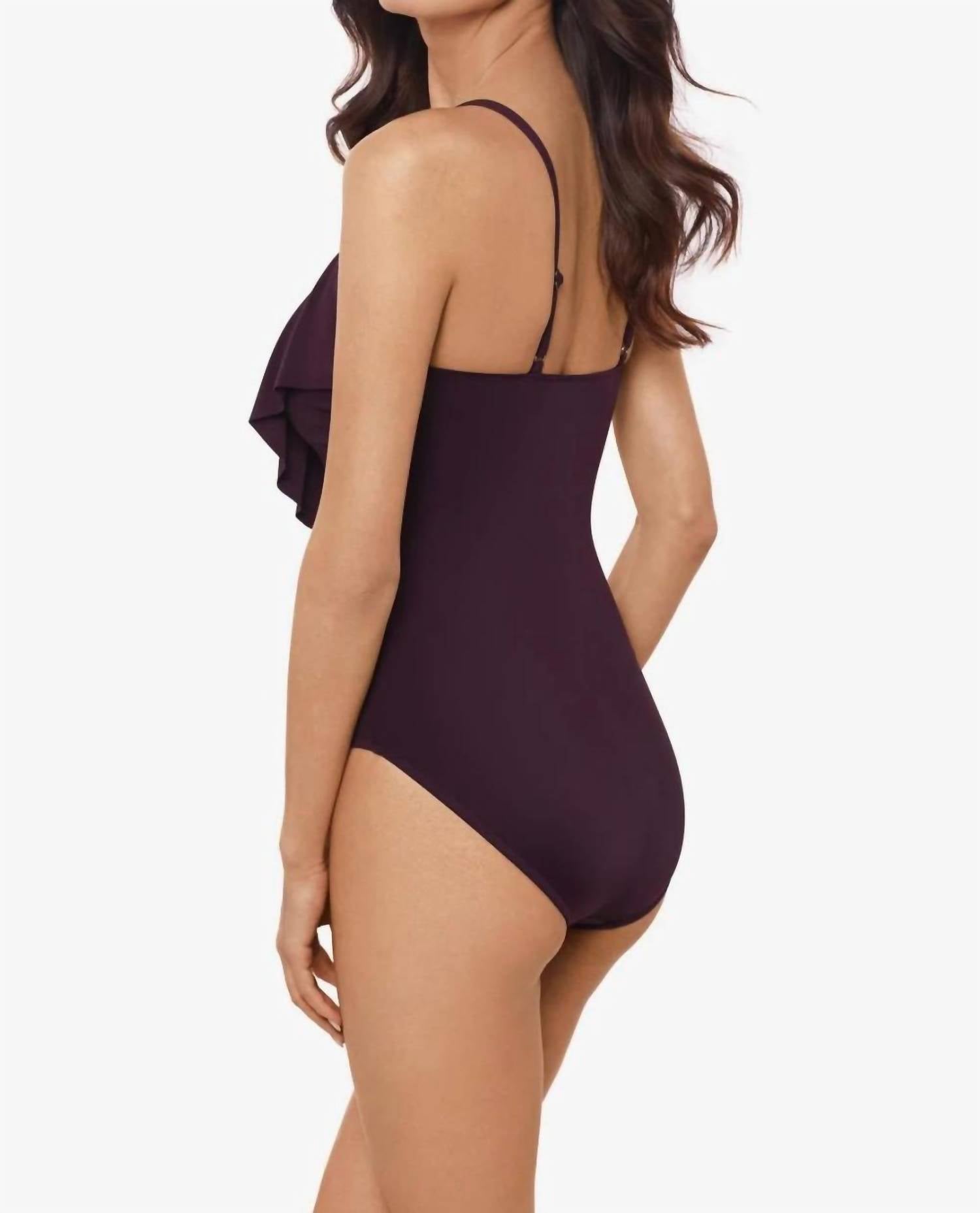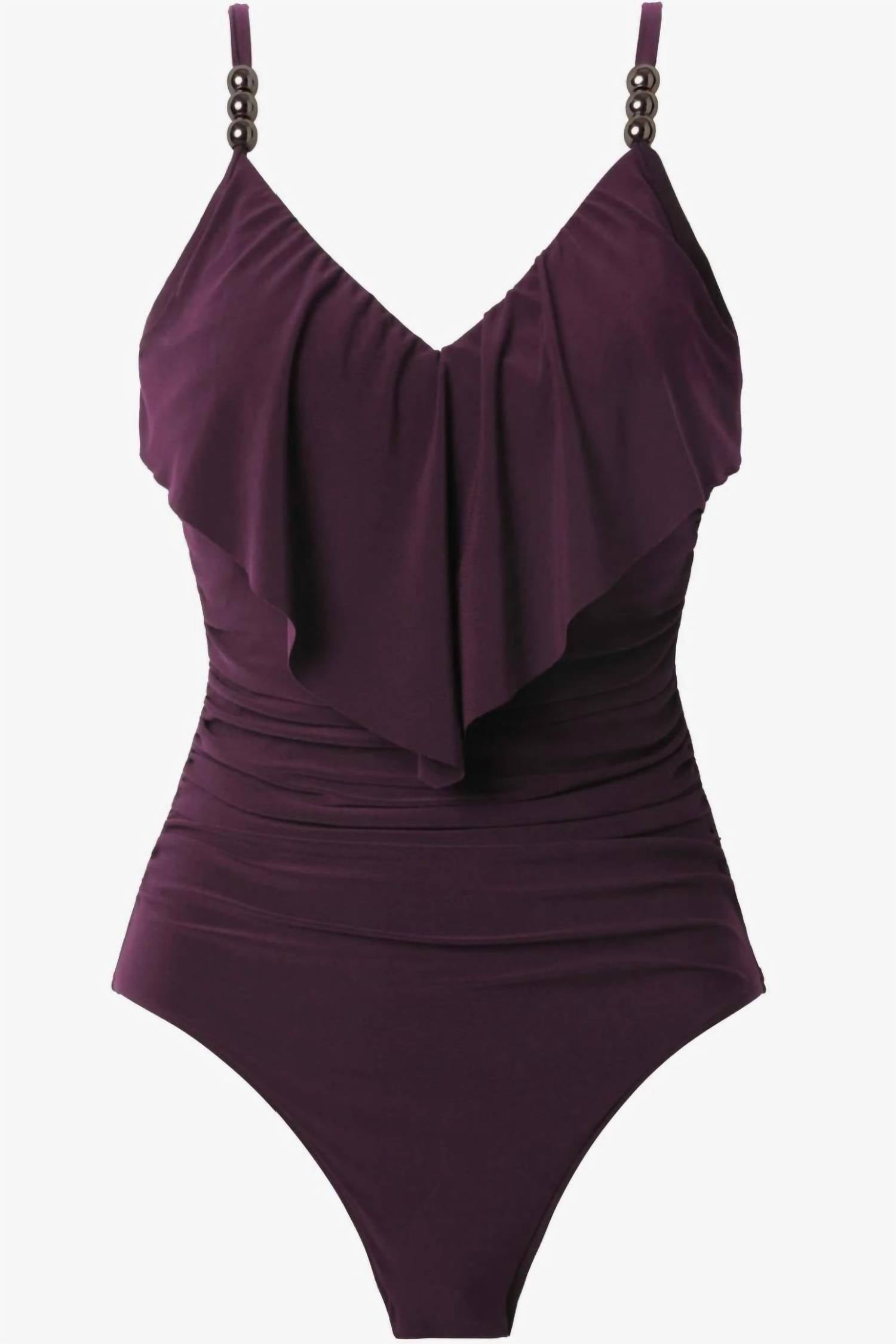 A one piece so chic you could even wear it as a bodysuit with your favorite pair of jeans. Experience effortless elegance with the Isabel One Piece Swimsuit by Magicsuit, presented in a stunning prune hue. Designed with adjustable straps and a V-neckline, it features a full straight back and moderate leg cut for classic coverage. The swimsuit is composed of 95% Polyester and 5% LYCRA Spandex, providing allover slimming and shaping with shirring in the bodice to conceal the tummy. Care instructions recommend hand washing and air drying, while avoiding chlorine bleach, ironing, and tumble drying.