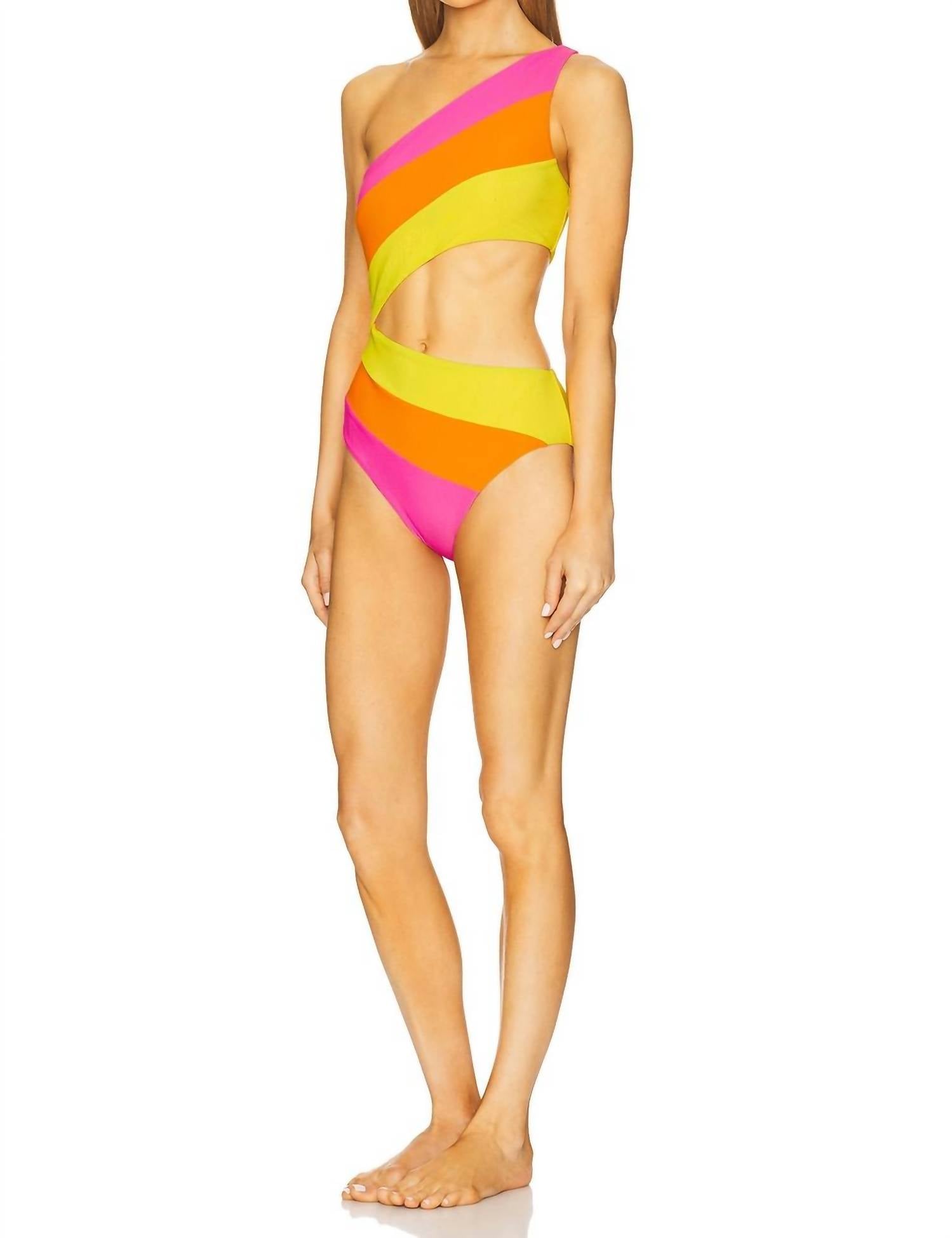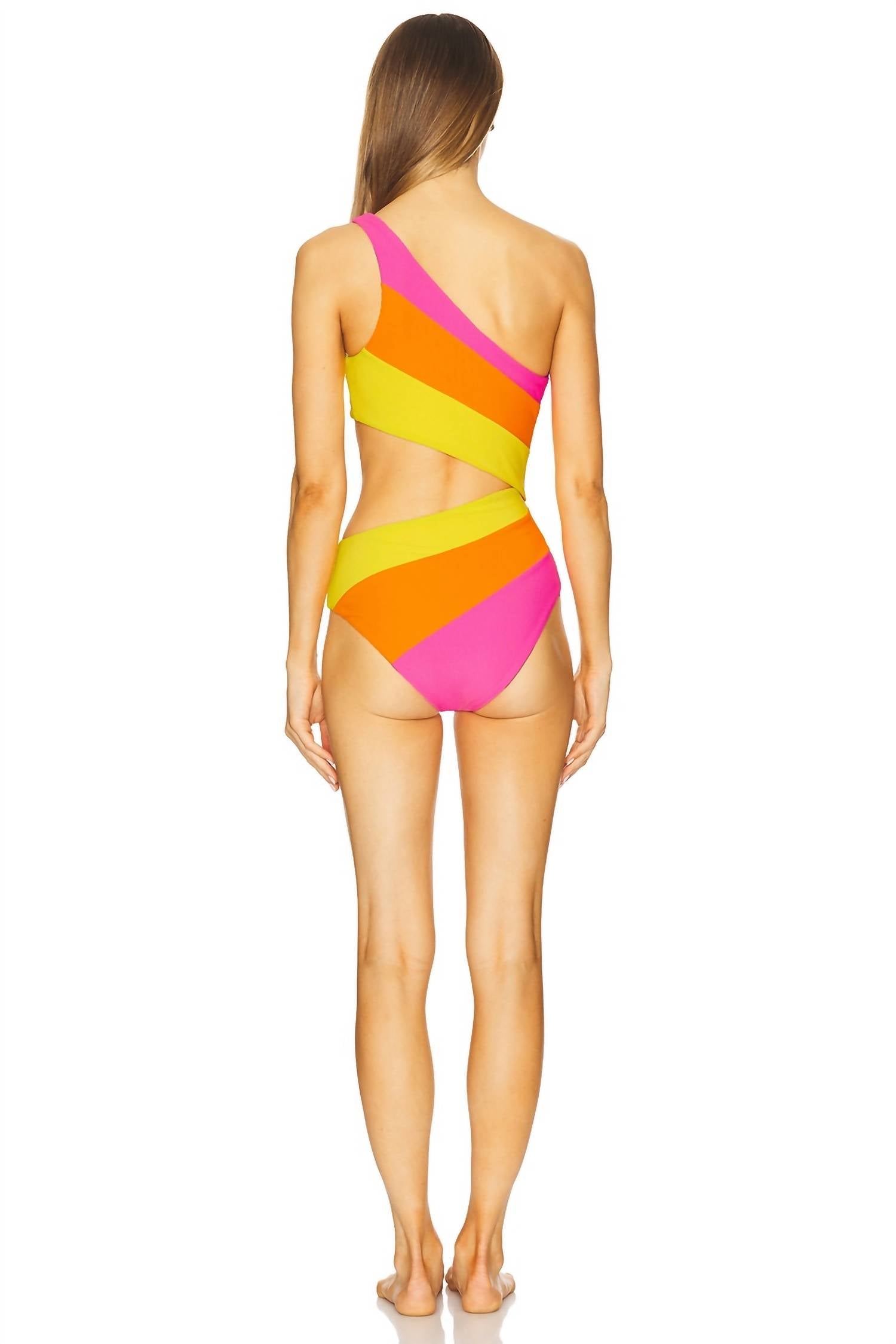This one piece fits like a glove and covers all the right areas. Step into summer with the Joyce One Piece Swimsuit by Beach Riot, a stunning creation in a vibrant Soleil Colorblock. Crafted from 82% Polyester and 18% Spandex, this swimsuit features a ribbed fabric and an asymmetrical neckline, offering both style and comfort. Its one-shoulder design and waist cut-out detail add a chic touch, while delivering moderate classic coverage. Designed for easy care, simply hand wash cold to maintain its bold stripe pattern, making it ideal for a maximalist summer beach day. Model is wearing a size small.