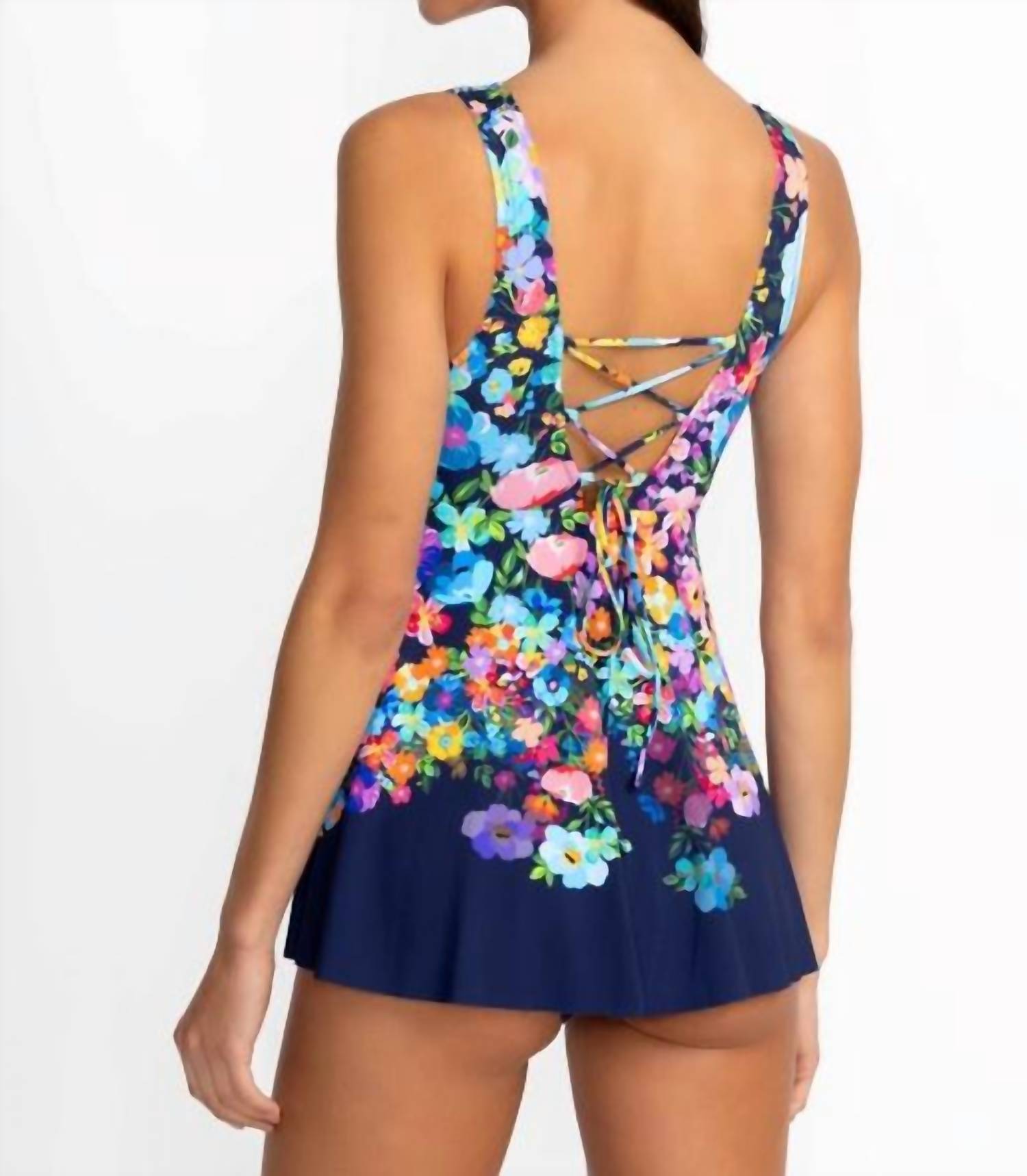 A one piece so chic you could even wear it as a bodysuit with your favorite pair of jeans. Beautifully adorned with vibrant floral blooms on a navy field, the Back Tie Skirted One Piece offers a hint of elegance to classic swimwear. Featuring a plunging V-neckline at the front and back, this skirted one-piece is finished at the back with an intricate lace-up detail for a unique flair. Hand Wash