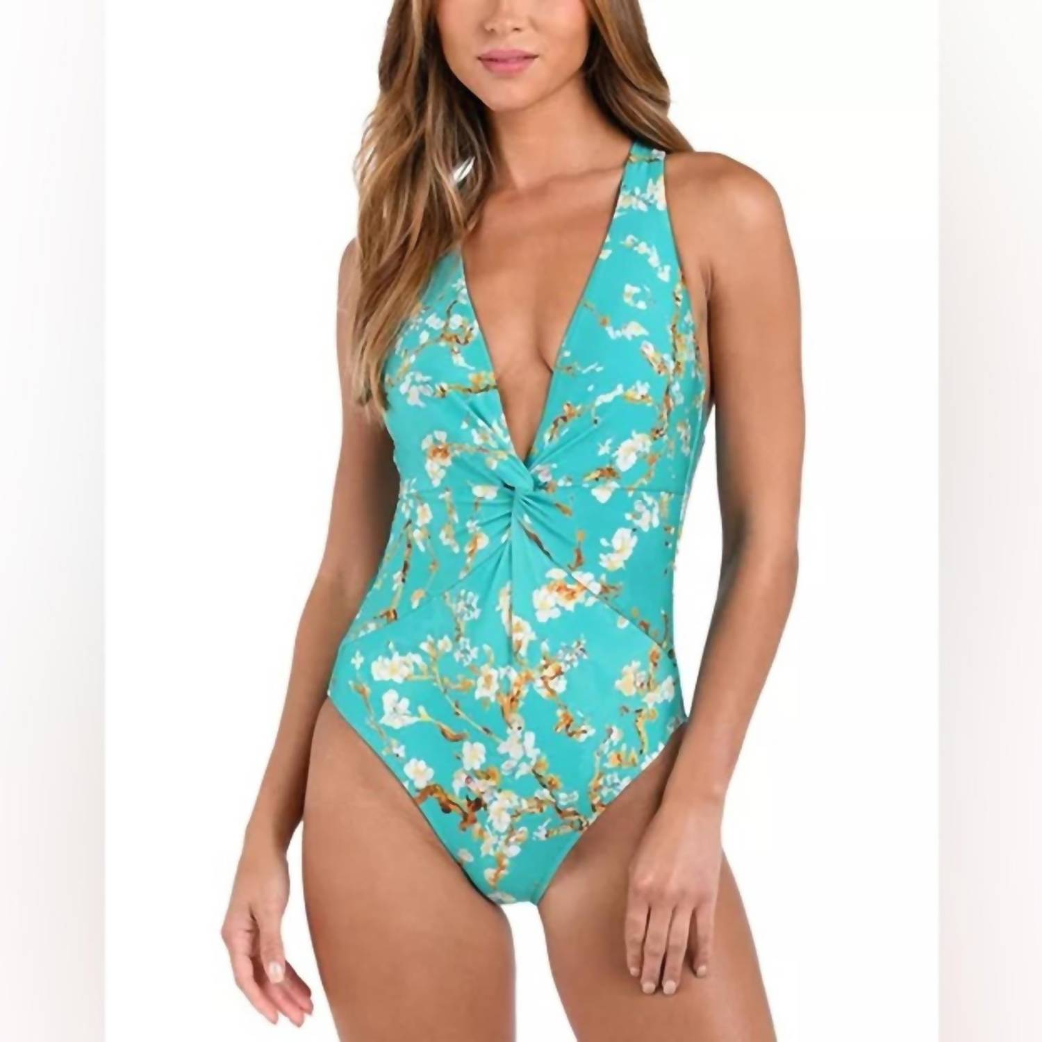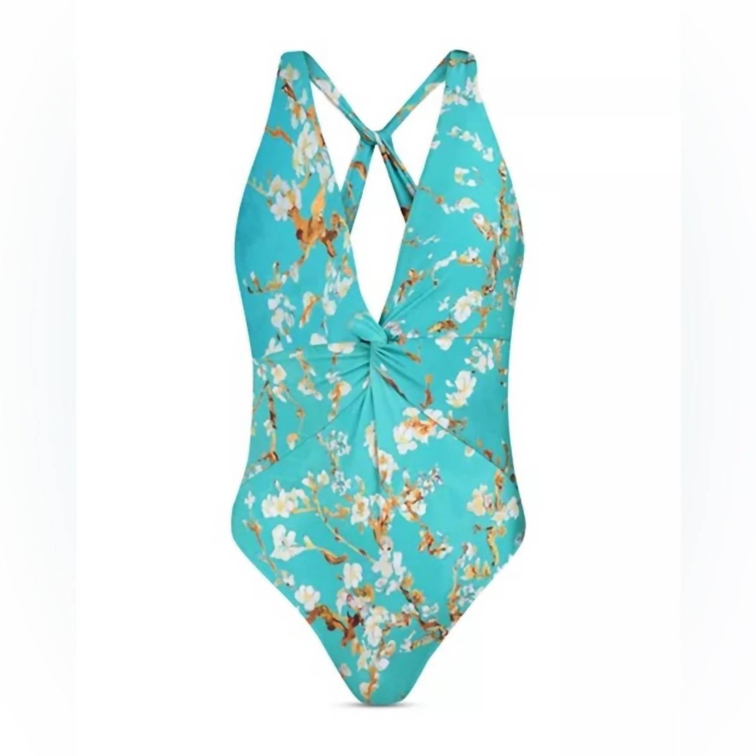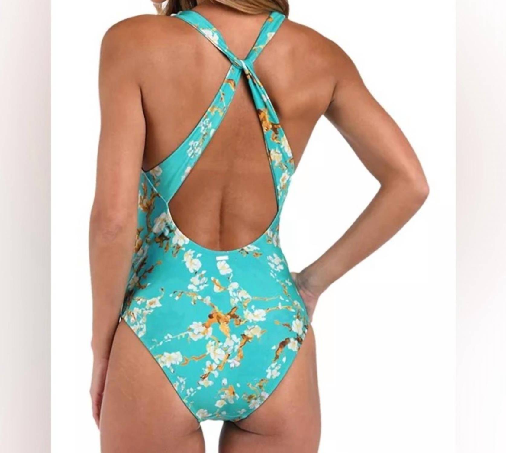 A one piece so chic you could even wear it as a bodysuit with your favorite pair of jeans. Dive into summer with the eye-catching aqua with a floral pattern. Stylish swimsuit boasts a four-way stretch and a soft lining for comfort, featuring a dramatic twist-front plunge, open back, and knotted straps. Crafted from an 80% Nylon, 20% Elastane blend with removable cups, providing both bold style and effortless support. Care for this boho chic essential by hand washing and line drying to maintain its vibrant look.