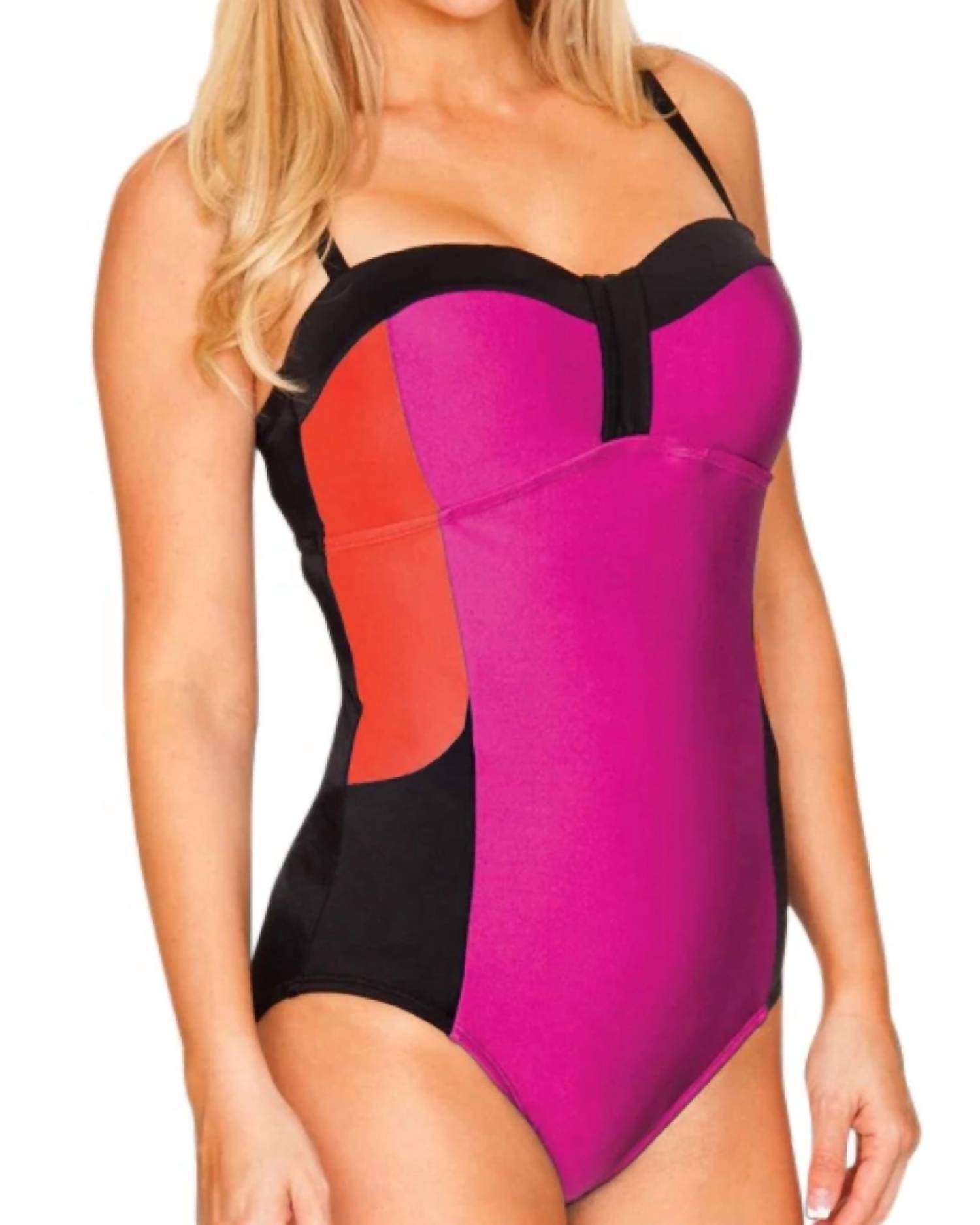 Designed to perfection and fit to flatter. You are going to love this one piece swimsuit. Dive into style with the Longitude Colorblock Lingerie One Piece Swimsuit in striking magenta, designed for those with a long torso. This women's swimsuit features lingerie shoulder straps with sliding adjustability for a personalized fit, a sweetheart neckline offering moderate coverage, and a powernet tummy control to smooth and slim the waist. With an empire waist and color-blocked bodice, it visually slims the torso while the soft cup bra provides comfort. Composition: 82% Nylon, 18% Spandex. Care: Hand wash, lay flat to dry. Perfect for summer beach days.