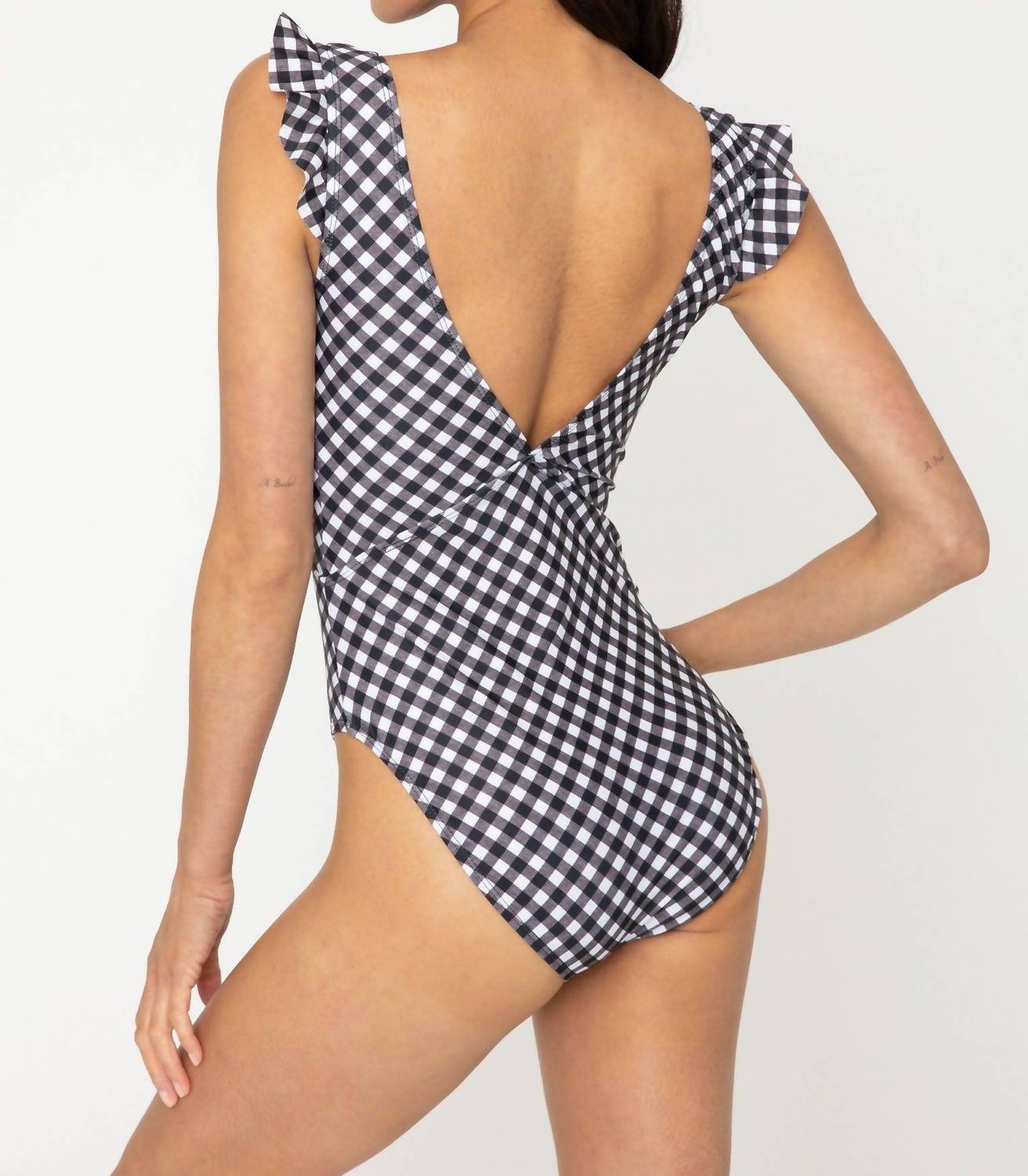 Designed to perfection and fit to flatter. You are going to love this one piece swimsuit. Elevate your beach style with the Low V-neck Ruffle One Piece Swimsuit by MARINA WEST SWIM, featuring ruffle sleeves and a removable bra pad for added convenience. This swimsuit in Gingham Black combines sleek polyester fabric with all-around stretch, ensuring ultimate comfort and mobility while engaging in any water sport. Derived from imported materials, its quick-drying feature and UPF 50+ protection make it an excellent choice for a summer beach day. Care instructions: Machine wash and line dry for lasting durability.