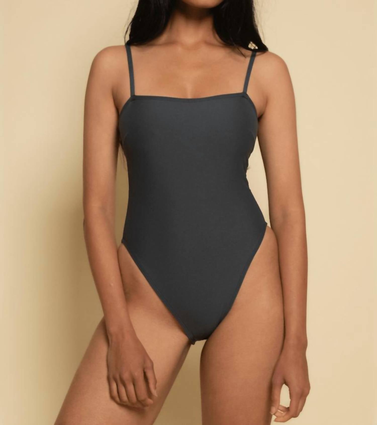 This one piece fits like a glove and covers all the right areas. Get ready for summer with the Jacelyn One-piece Swimsuit by Montce, a chic addition to your beachwear collection in a solid charcoal hue. This women's swimsuit offers medium support and coverage, featuring adjustable shoulder straps and flattering ruching at the sides to accentuate the waist, with an extra high cut style to elongate the legs. Made from a durable nylon blend (90% Suplex FD, 10% Extra Life Nylon) and featuring gold tarnish-resistant metal hardware, it effortlessly doubles as swim or casual apparel. Care is easy with a hand wash routine, making it perfect for a stylish 90s fashion-inspired beach day.
