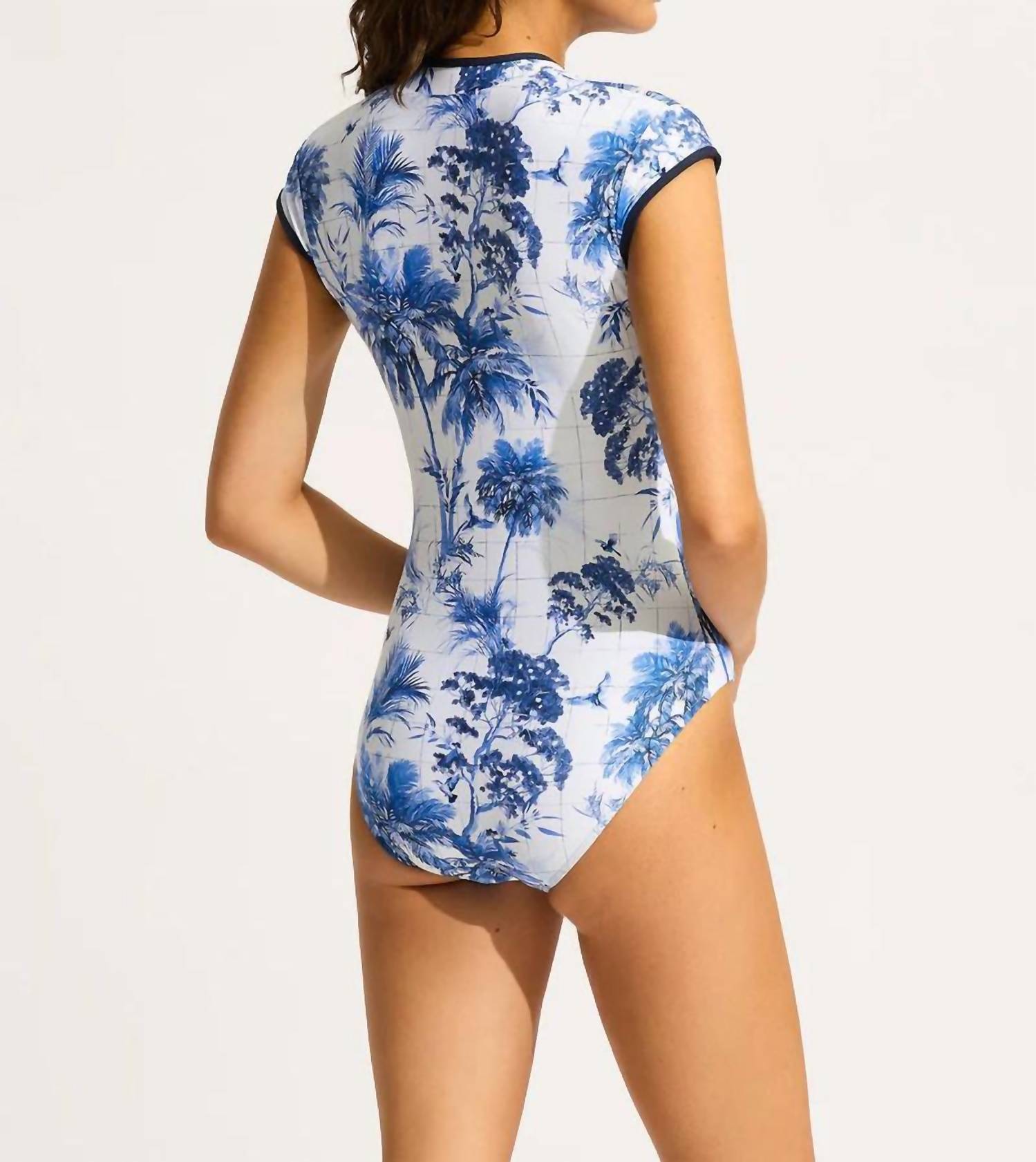 A one piece so chic you could even wear it as a bodysuit with your favorite pair of jeans. Introducing the Women's Marbella Zip Front One Piece by Seafolly, a stylish swimwear choice for your summer vacation. Featuring a zip front lock for a versatile fit and a regular legline that flatters the leg, this one-piece comes in a vibrant blue with a chic floral pattern. Built-in removable cups and an internal shelf bra provide shape and bust support. Composition: 80% Nylon, 20% Elastane; Lining: 82% Recycled Nylon, 18% Elastane. Origin: Specified in US sizes. Ideal for maximalist trends and full coverage needs.