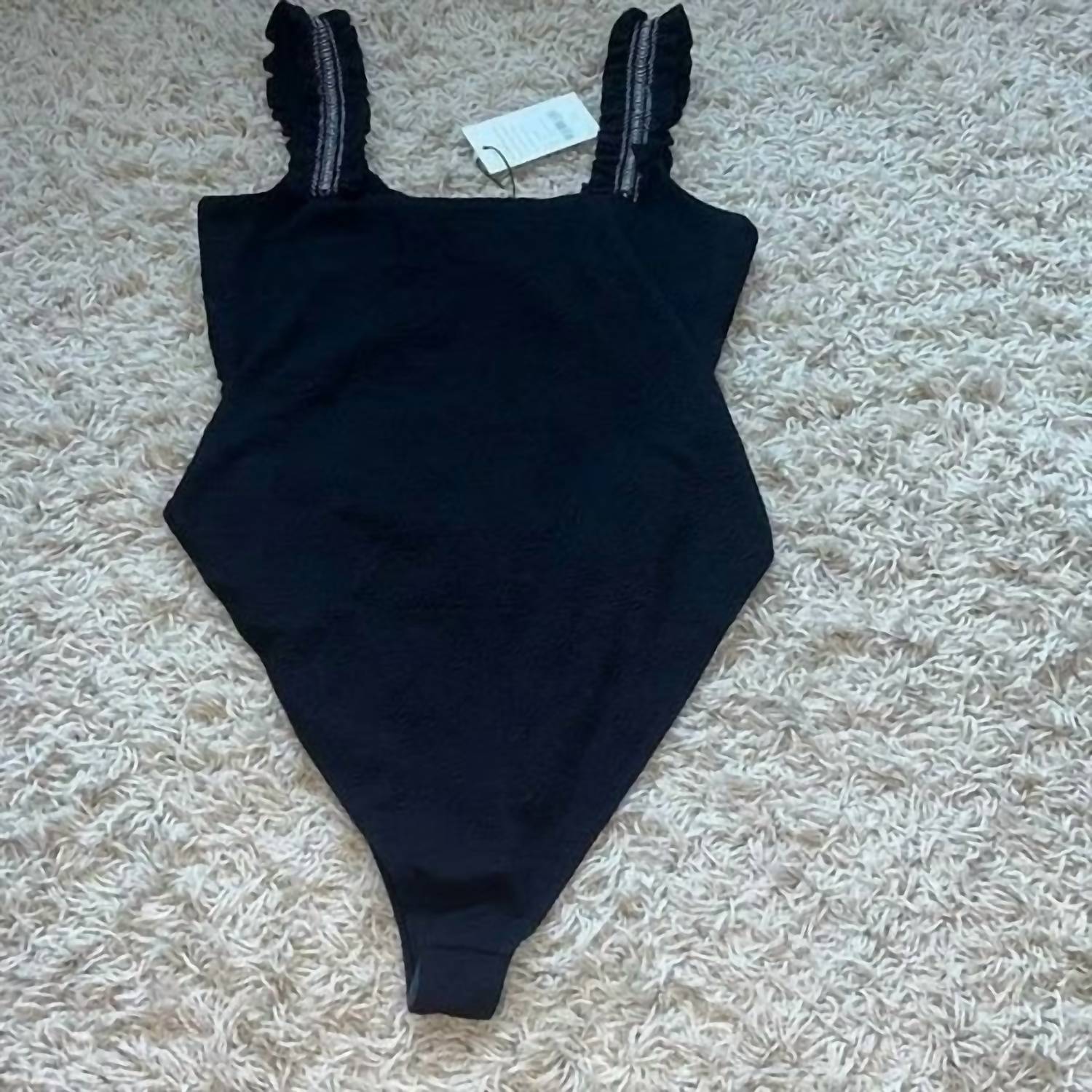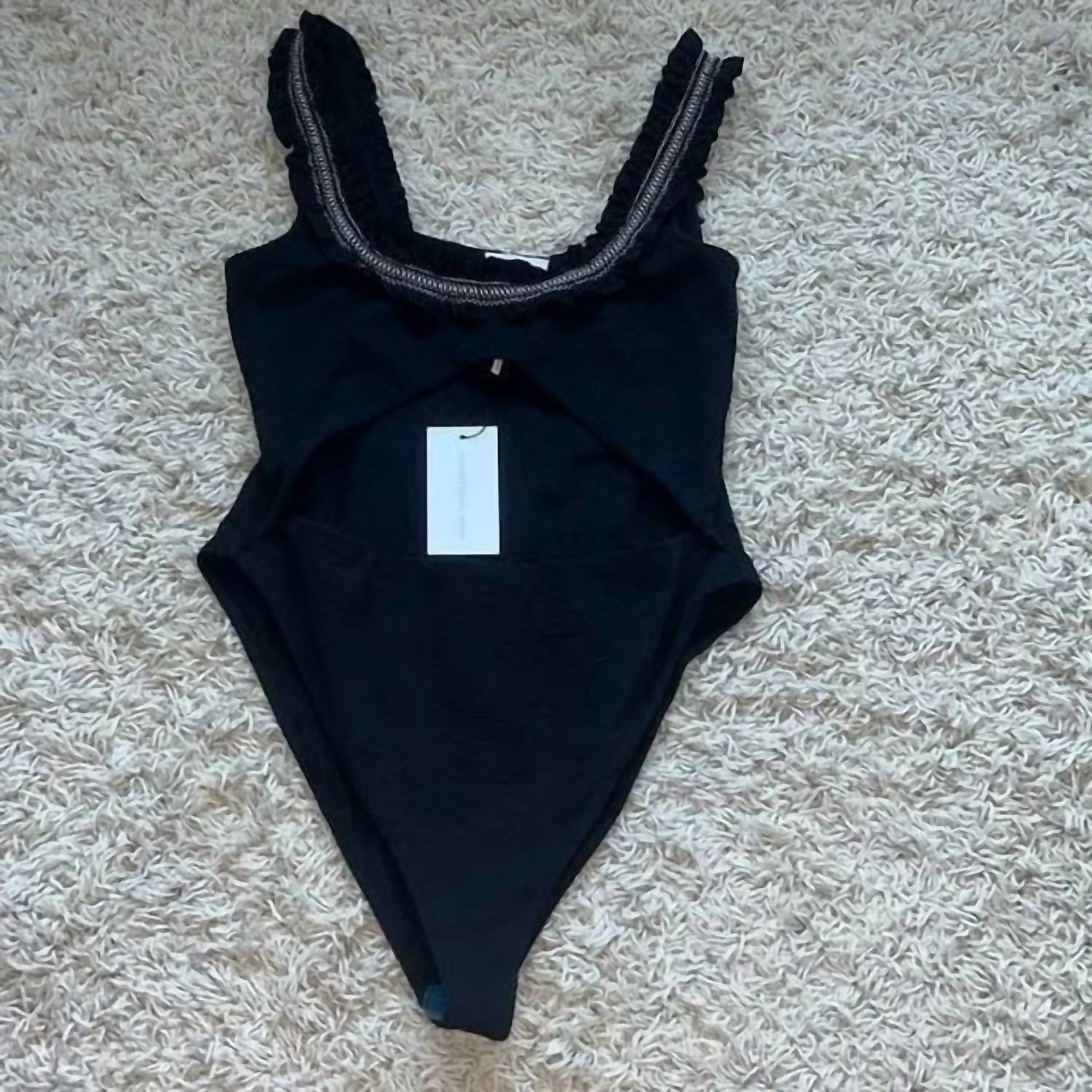 Designed to perfection and fit to flatter. You are going to love this one piece swimsuit. Elevate your swimwear collection with the Women's Ruffle Cut Out One Piece by SOMETHING NAVY, designed for stylish summer vacations. This solid black one-piece features a boho chic vibe with playful ruffle accents and strategic cut-outs for a classic yet modern look. Crafted for women who embrace understated elegance, it's perfect for soaking up the sun by the pool or beach.
