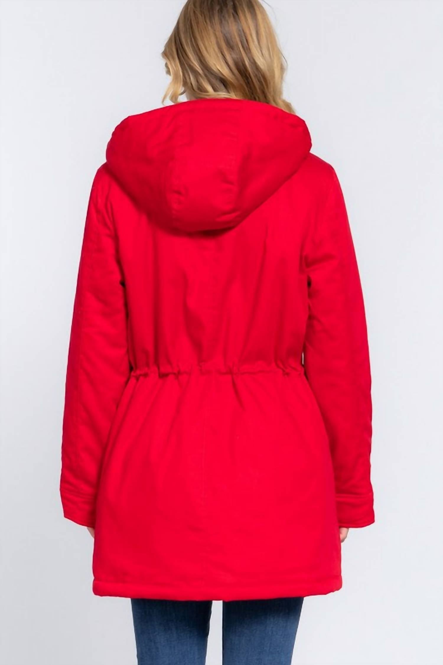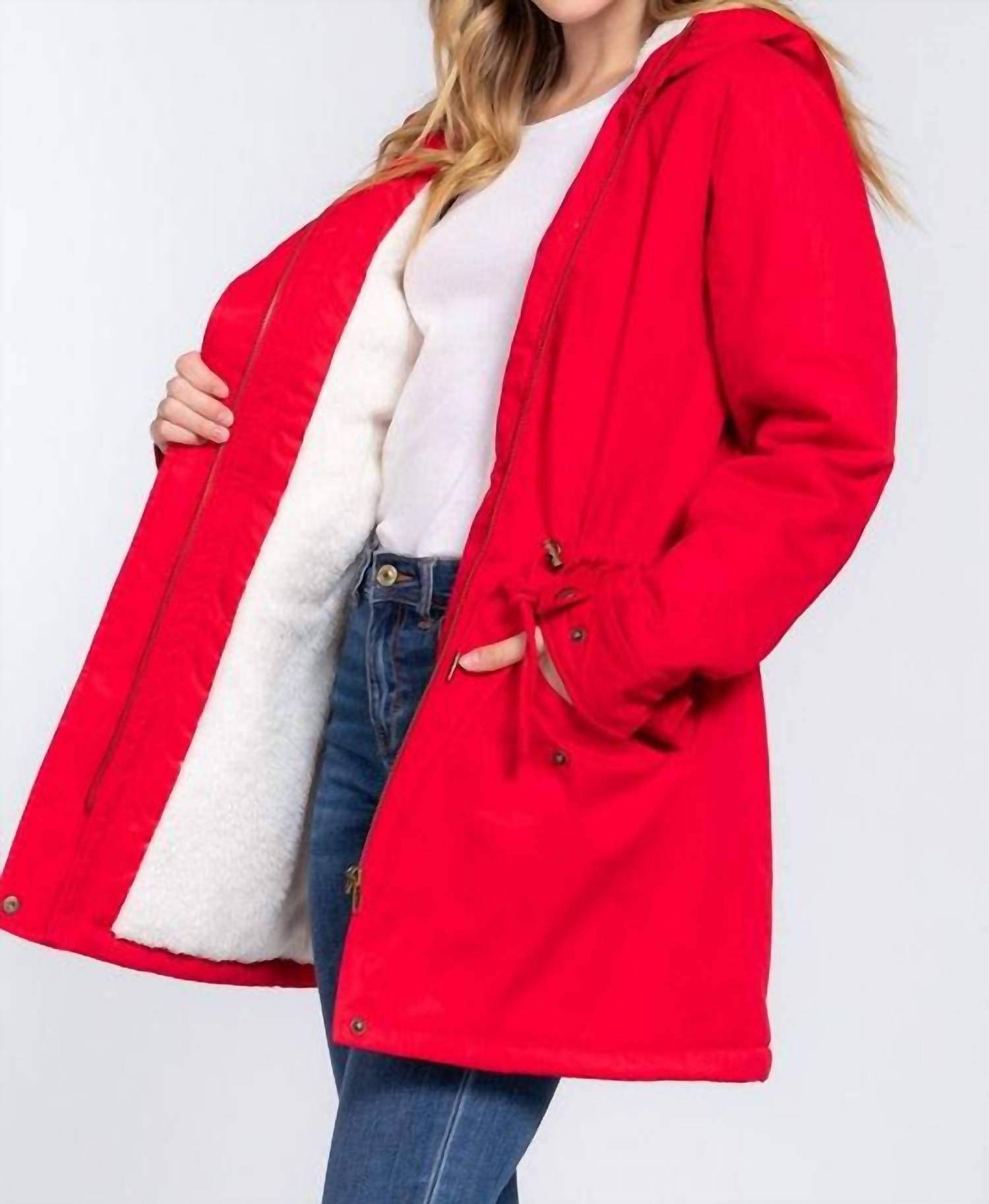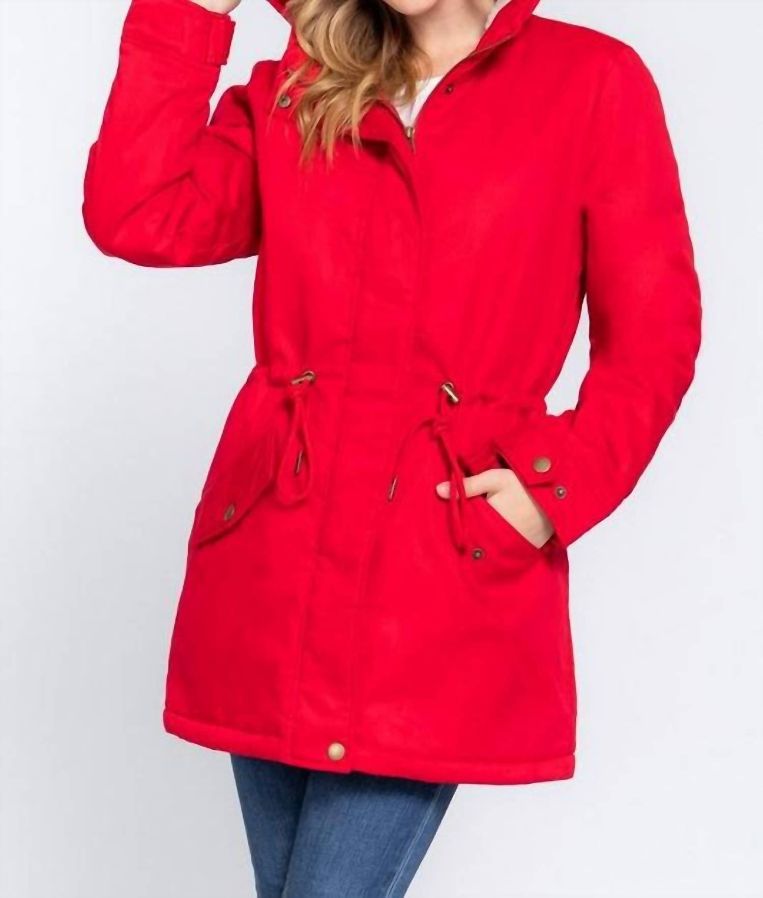 Bundle up, buttercup. This will be your go-to outerwear jacket all season long. Experience ultimate comfort with the Fleece Lined Fur Hoodie Utility Jacket by Active USA, crafted to keep you warm and stylish. This long sleeve jacket in vivid red features a luxurious faux fur lining for added coziness and comes with a secure zip closure, making it an ideal choice for chilly winter days. Made from lightweight 100% cotton, this solid-patterned ski jacket ensures you stay comfortable in any weather. Easy care with machine wash on a gentle cycle for your convenience.