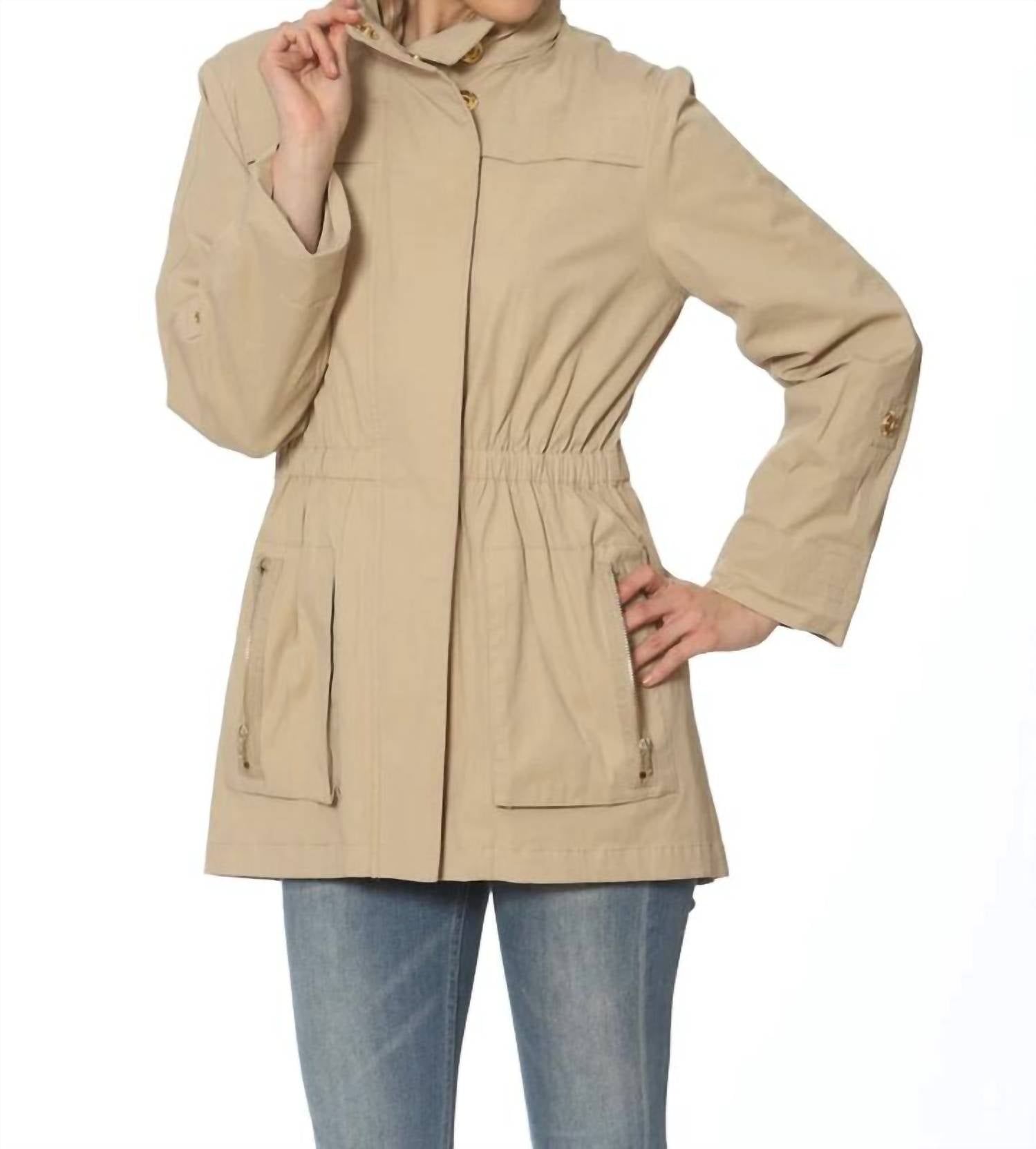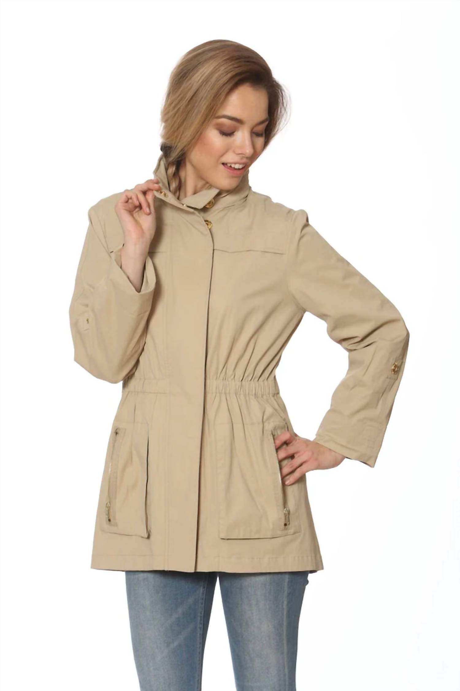 The Anna Waterproof Cinch Waist Rain Jacket by Ciao-Milano is a luxurious addition to your winter travel wardrobe. Expertly crafted with a cotton blend, this khaki long sleeve jacket features a solid pattern and a collar neckline, styled for a minimalist look. It includes practical pockets and a secure zip closure to maintain the waterproof quality, ensuring you stay dry and stylish. Care instructions: Hand wash and line dry to extend the jacket's life.