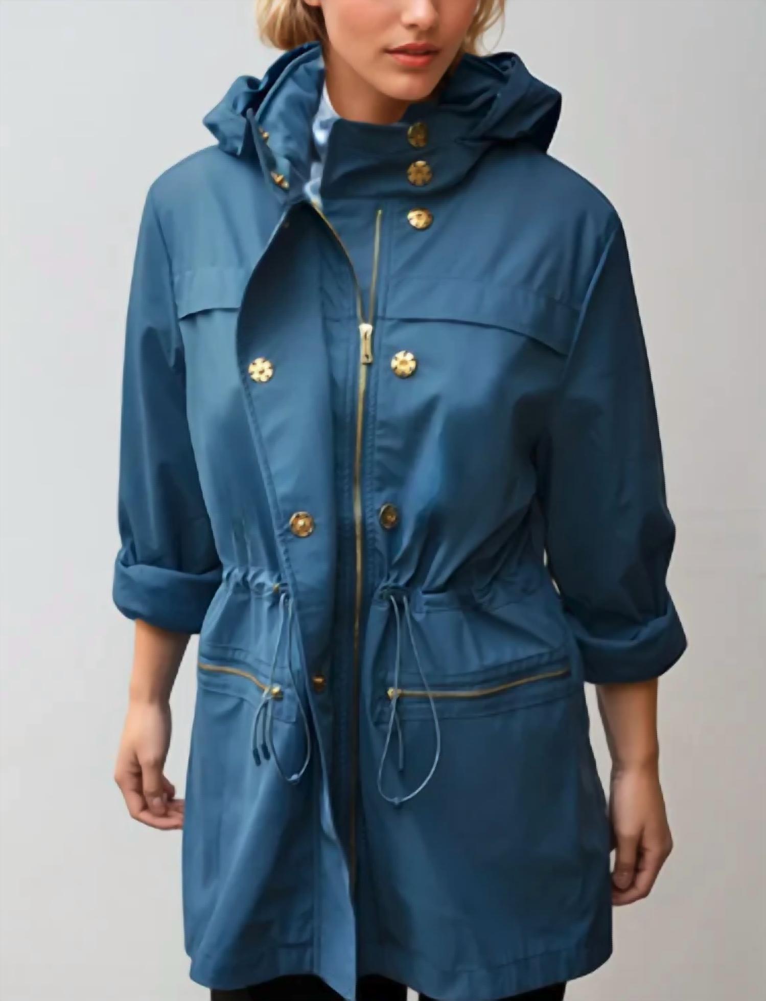 Bundle up, buttercup. This will be your go-to outerwear jacket all season long. Introducing the Kasia Anorak Water Proof Jacket by Ciao-Milano, a perfect blend of style and functionality for your winter adventures. It comes in a chic French Blue color and features long sleeves and a hooded neckline, designed in a solid pattern. Made from a durable cotton blend, it promises 100% waterproof protection with a zip closure and convenient pockets. This travel-friendly piece offers minimalist style, ideal for Thanksgiving outings. Available in sizes XS to XL.