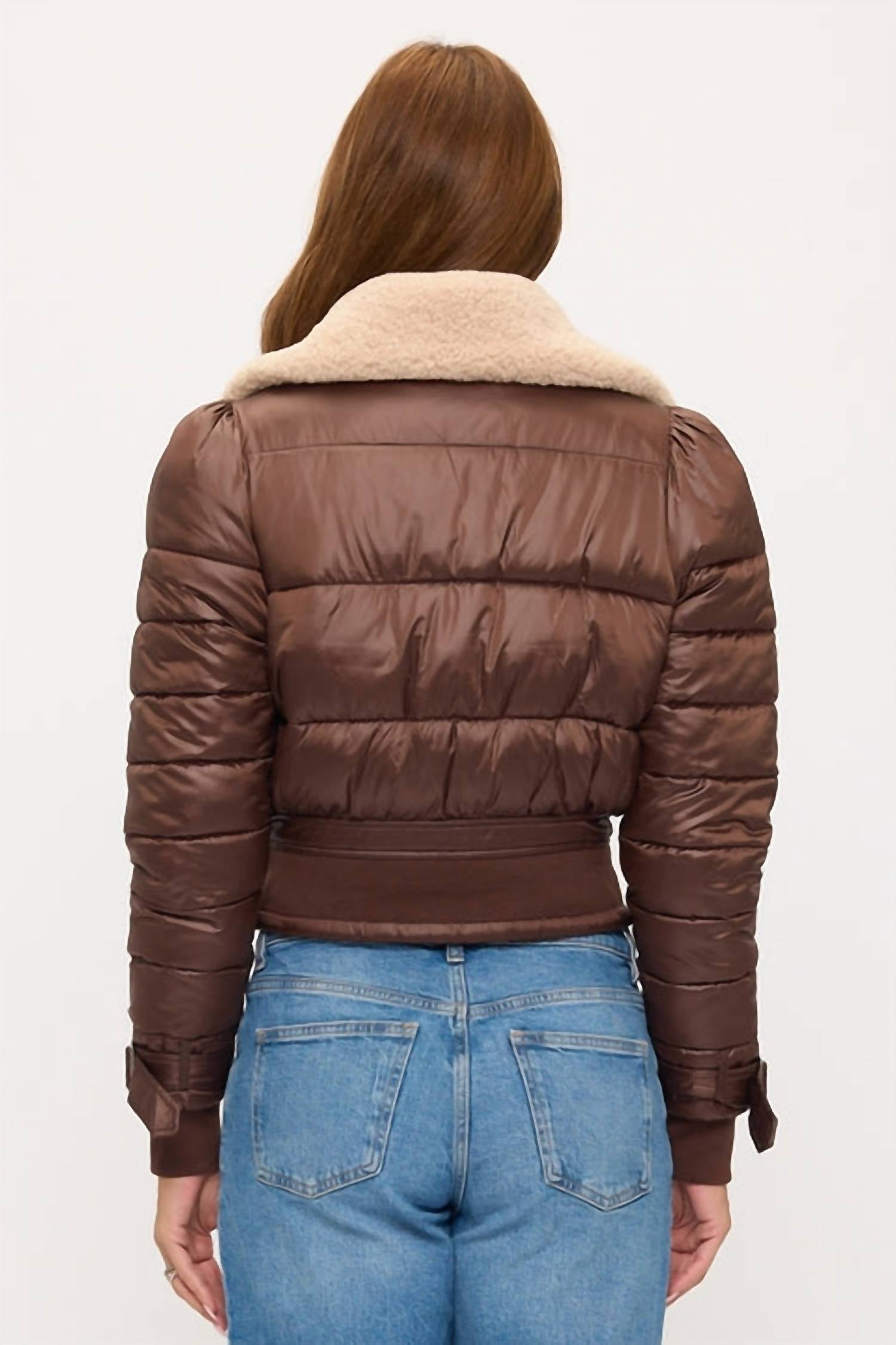 You'll be reaching for this puffer jacket all season long. Experience winter luxury with the Metro Athletic-inspired Puffer Jacket by Coalition LA in a sophisticated brown hue. This women's puffer features long sleeves and a chic cropped, fitted silhouette, highlighting a zip closure for easy wear. With a quilted solid pattern and plush faux fur collar, this piece delivers warmth and style ideal for travel or preppy trends. Designed with pockets for added convenience, it seamlessly transitions from outdoor wear to urban adventures.