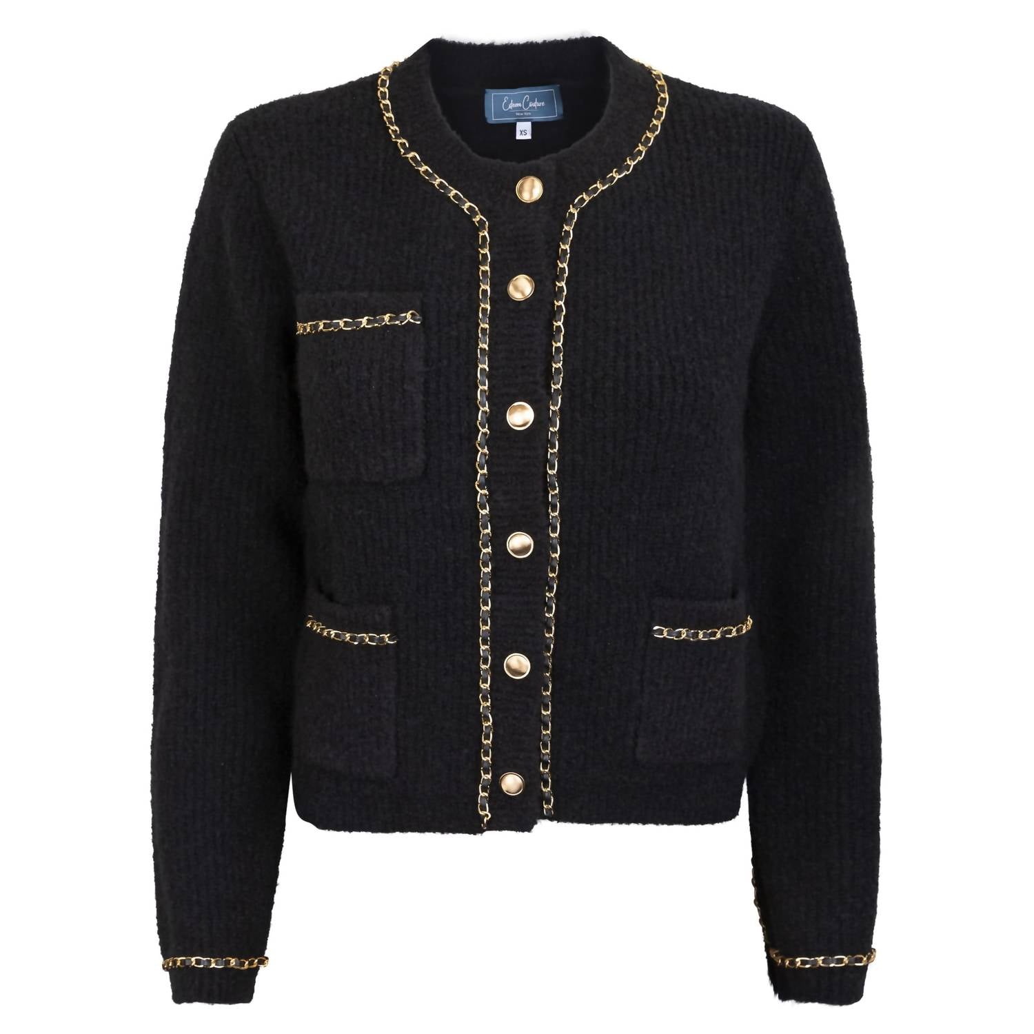 A casual yet cool jacket that every closset needs. Introducing the Caroline Knit Jacket by Esteem Couture, a chic addition to your wardrobe in classic black. This jacket boasts long sleeves and is crafted from premium knit fabric, adorned with elegant gold chain details for a touch of luxury. Featuring a button closure, it's designed with a flattering fitted silhouette and a timeless crewneck for seasonal wear. Perfect for New Year's Eve celebrations or any holiday party, this textured, unlined jacket caters to sophisticated tastes.