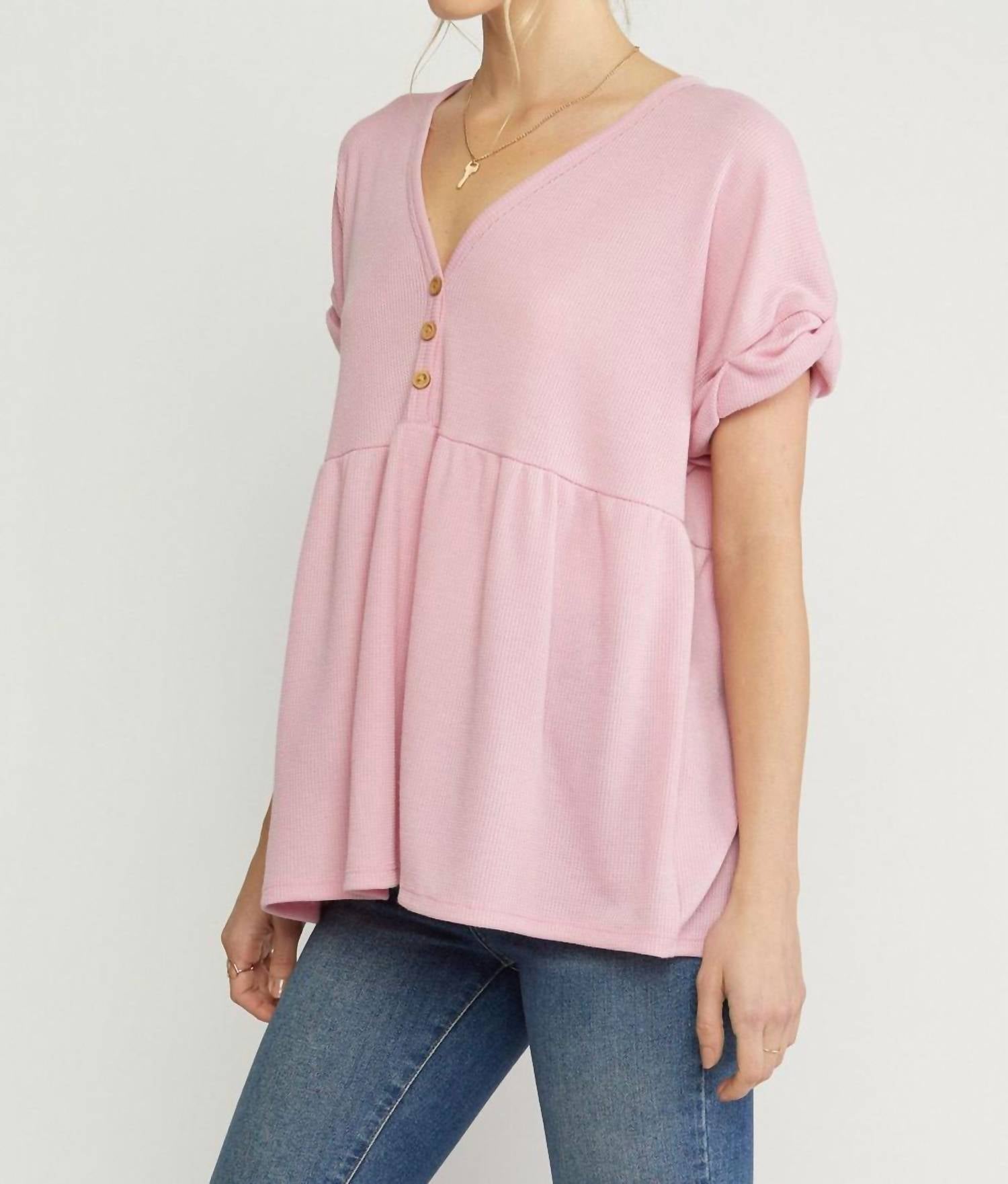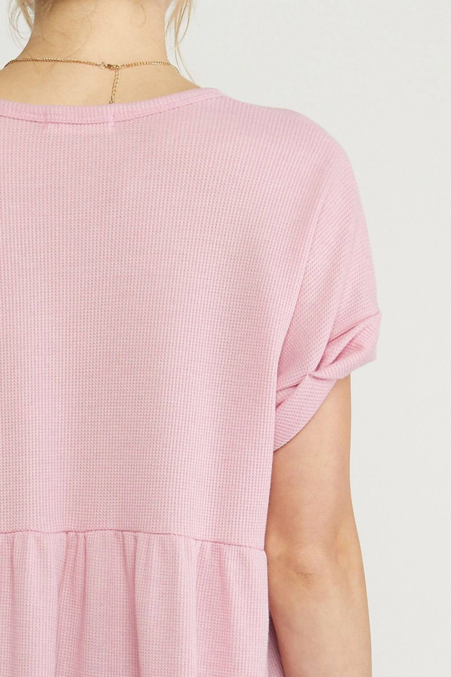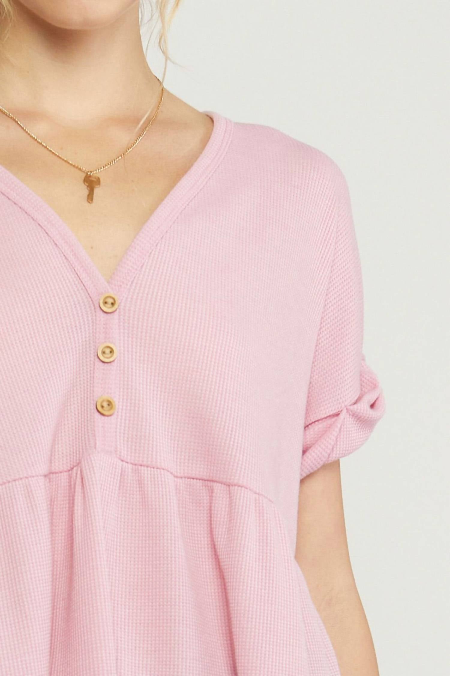 It features a V-neckline with three buttons, short twisted sleeves, is made from a light weight mini waffle knit fabric and has a flattering a-line flowy oversized babydoll silhouette. Small: Bust 42" Length 28", Medium: Bust 44 Length 28". Large: Bust 46" Length 28", XL: Bust 52" Length 29". 1X: Bust 54" Length 29", 2X: Bust 56" Length 29". 85% Polyester, 10% Rayon, 5% Spandex. Soft stretchy fabric. Hand wash or dry clean. Made in the USA.