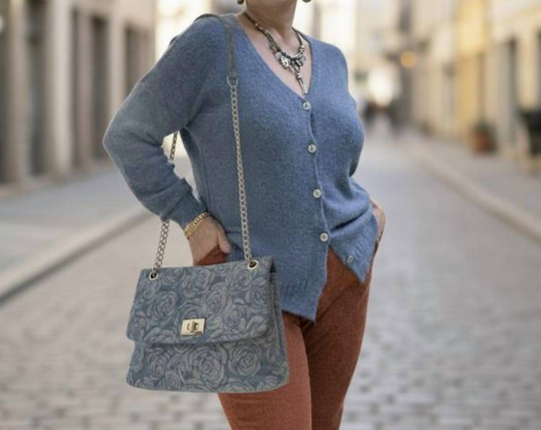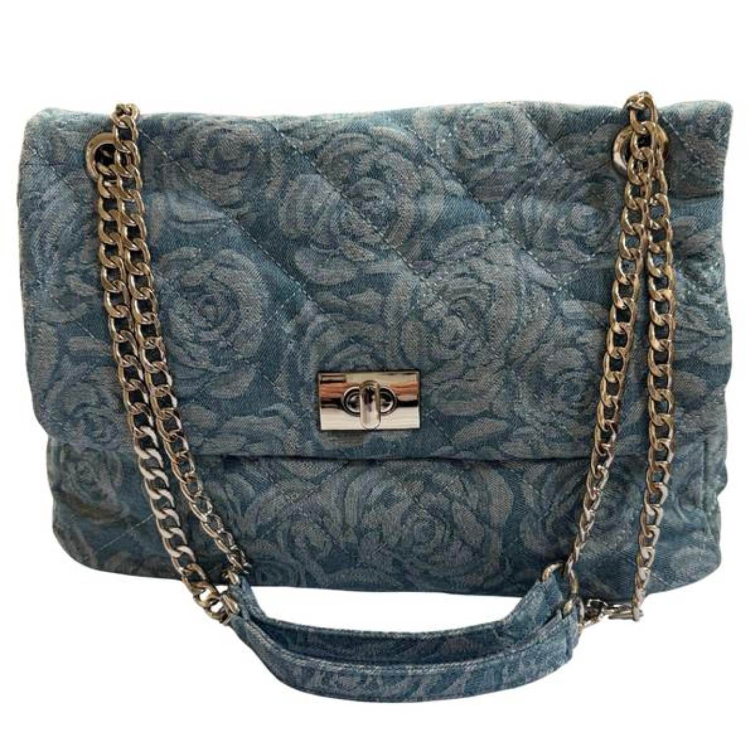 Casually cute and the perfect complement to any day dress. A stylish denim bag featuring a delicate floral pattern, combining durable fabric with a soft, feminine touch, perfect for everyday use.