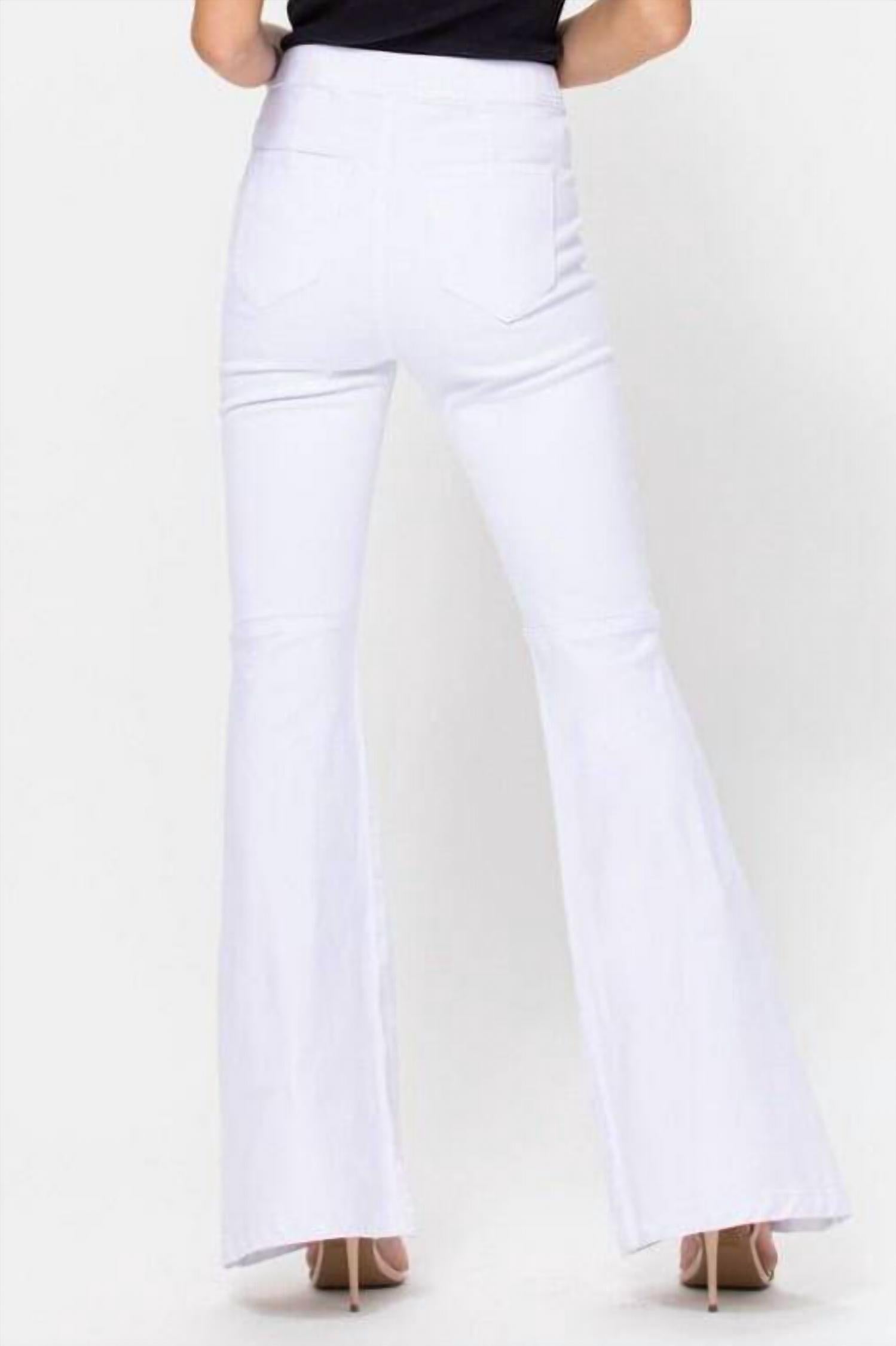 Just as cute as they are comfortable. Elevate your wardrobe with the High Rise White Pull On Flare Jeans by CELLO, perfect for a chic and versatile look. Featuring a high-rise fit and flared leg style, these jeans boast a solid white color with pocket detailing. They offer stretch and comfort for all-day wear. Closure: Button closure. Care: Machine wash and lay flat to dry. 66% Cotton 32% Rayon 2% Spandex