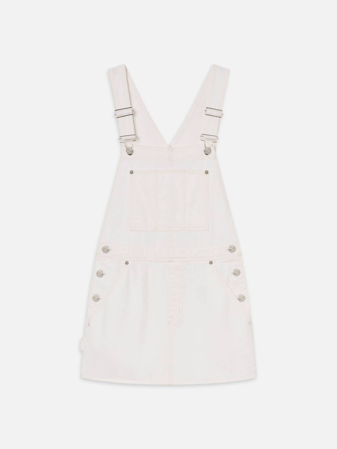 Who doesn't love a good pair of overalls? Meet the Au Natural Clean Skirtall by FRAME, a versatile summer essential in solid ecru. Crafted from 100% premium cotton luxury denim, this mini-length piece combines the ease of a skirt with the charm of overalls, featuring adjustable straps and trouser-style pockets. The skirtall measures 24" long from shoulder with a 42" skirt opening, ensuring a flattering silhouette as the fabric conforms to your figure. Closure is secured with buttons. Care: Machine wash cold.