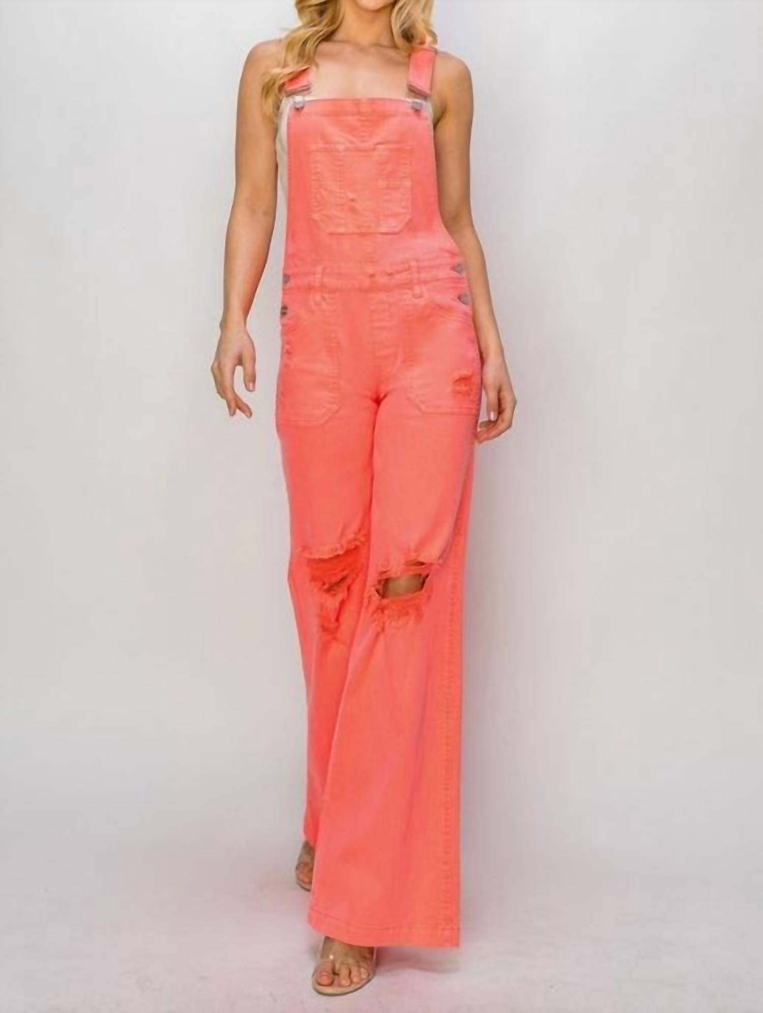 Who doesn't love a good pair of overalls? Embrace style and comfort with the Distressed Wide-leg Overall by RISEN, available in a statement Coral Crush hue. These women's overalls are crafted from a stretchy and breathable blend of 92% cotton, 6% polyester, and 2% spandex, ensuring a perfect balance of structure and flexibility. The design features a 10" rise and 32.5" inseam for a flattering relaxed fit with a trendy wide-leg silhouette. Equipped with adjustable straps, a classic bib pocket, and side button closures, these overalls are both functional and stylish. Care for them with a machine wash to maintain their preppy, spring-ready appeal.