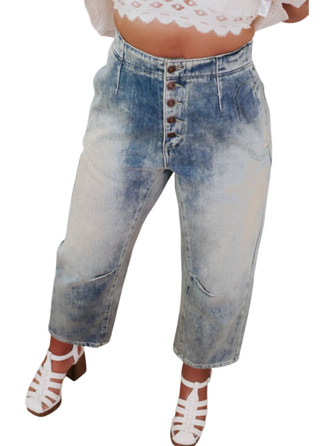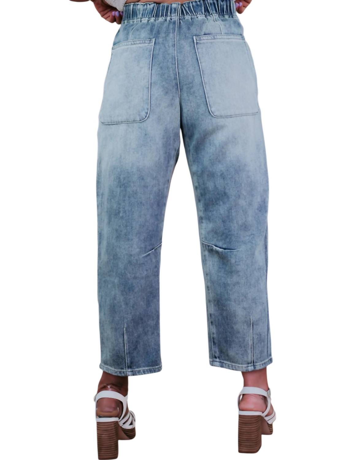 Who doesn't love a good pair of overalls? Barrel Denim Jeans by Oli & Hali Vintage-inspired contemporary look 100% cotton Mineral wash Classic Barrel Jean loose boyfriend fit Elastic waistband Solid blue shade Wide-leg style Practical pockets Button fly closure Varied sizing Lay flat to dry.