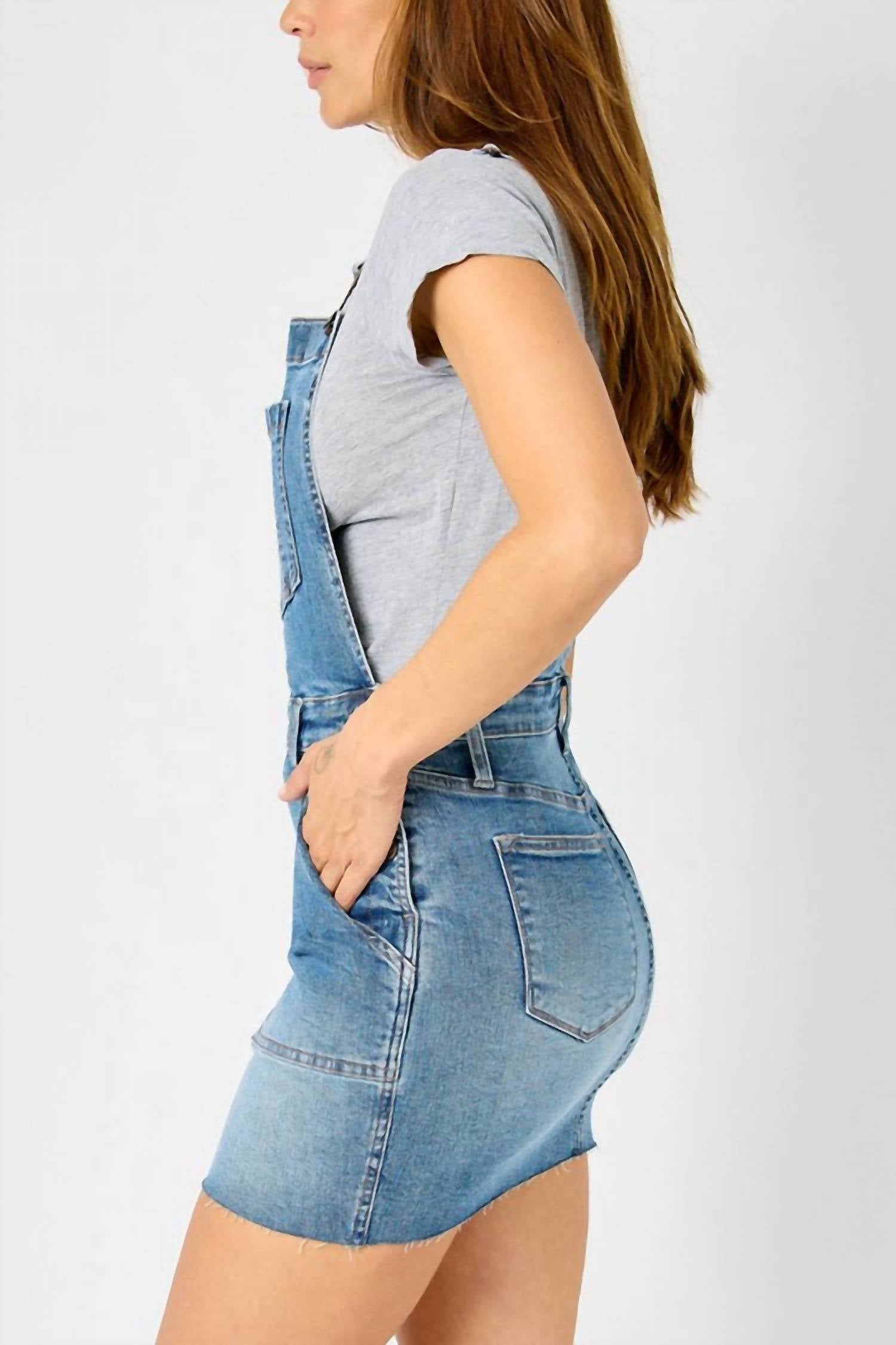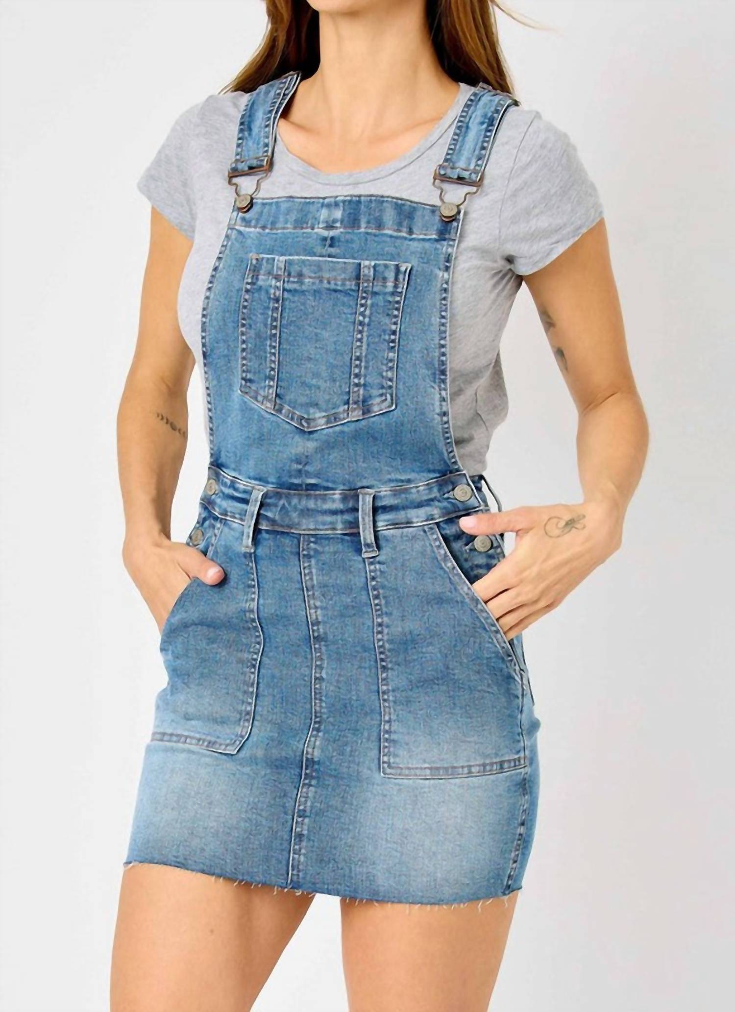 Wear these overalls any season by layering your favorite tank top or turtleneck underneath. Unveil your summer style with the Women's Raw Hem Overall Skirt by Judy Blue, an essential blue piece crafted from a comfortable cotton blend. Designed with a medium wash, this skirt features a solid pattern that ensures versatility and effortless pairing. The hook and eye closure provides a secure fit, and the piece includes pockets for added functionality. Embrace warm weather with this chic addition to your wardrobe.