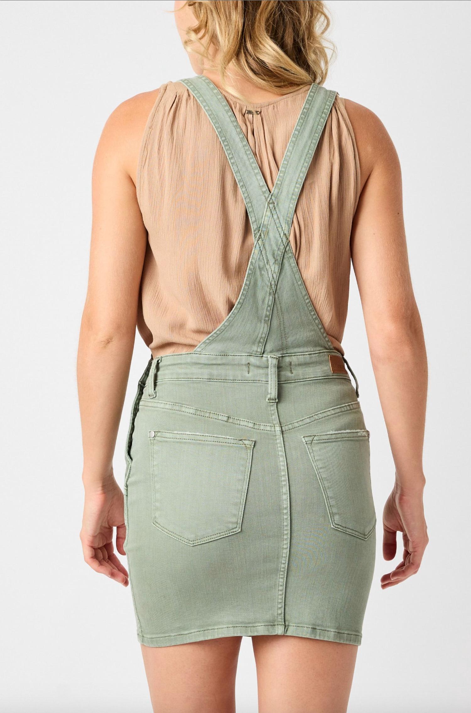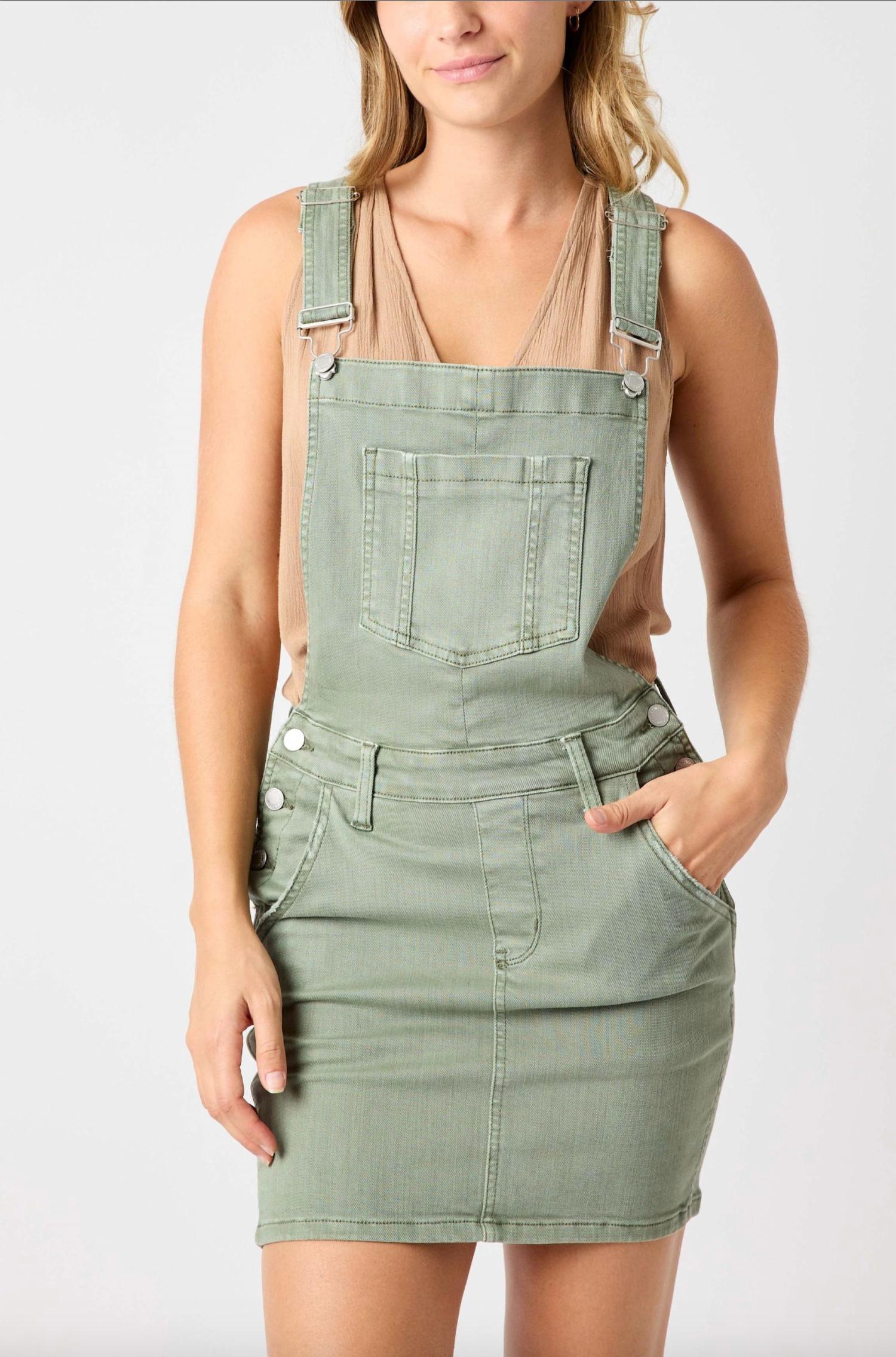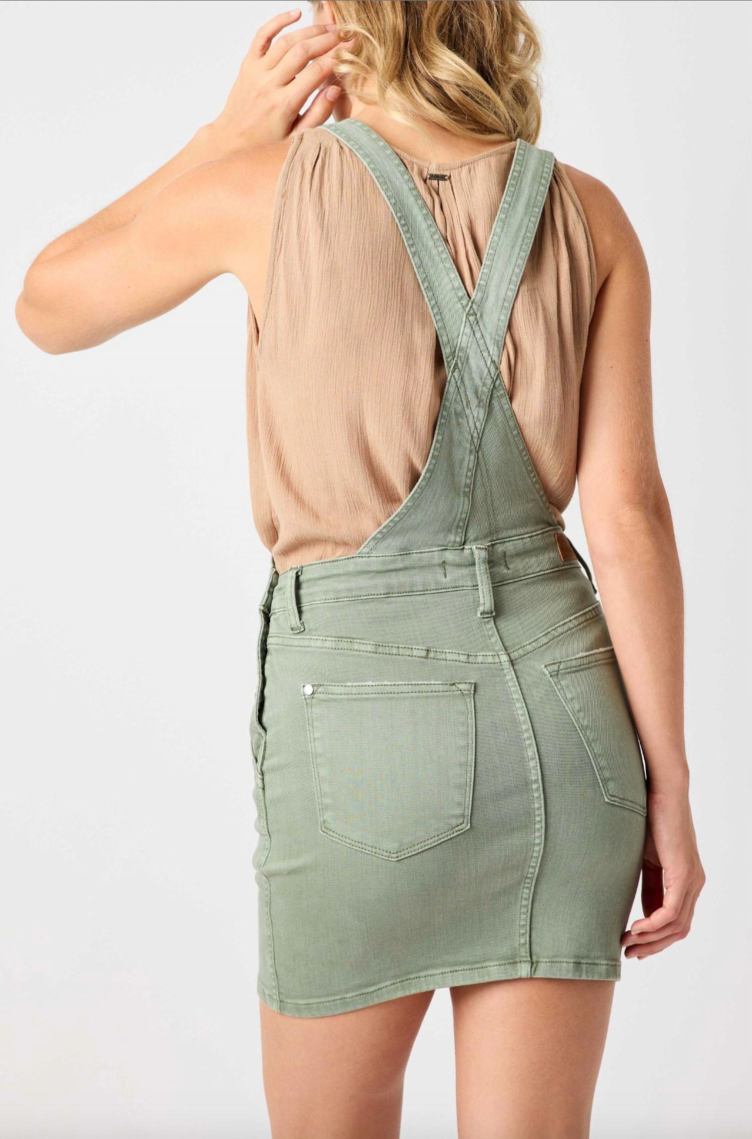 Easy, stylish and comfortable? We love a good pair of overalls. Elevate your spring wardrobe with the Judy Blue Garment Dyed Overall Skirt in a fresh sage hue, perfect for a holiday party. Crafted from a cotton blend of 93% Cotton, 6% Polyester, and 1% Spandex, this comfortable skirt offers a flattering fit with its 16" center front and 17" center back lengths. Convenient button closure and handy pockets make it a practical choice for everyday wear. Care is simple with machine washing and tumble drying.