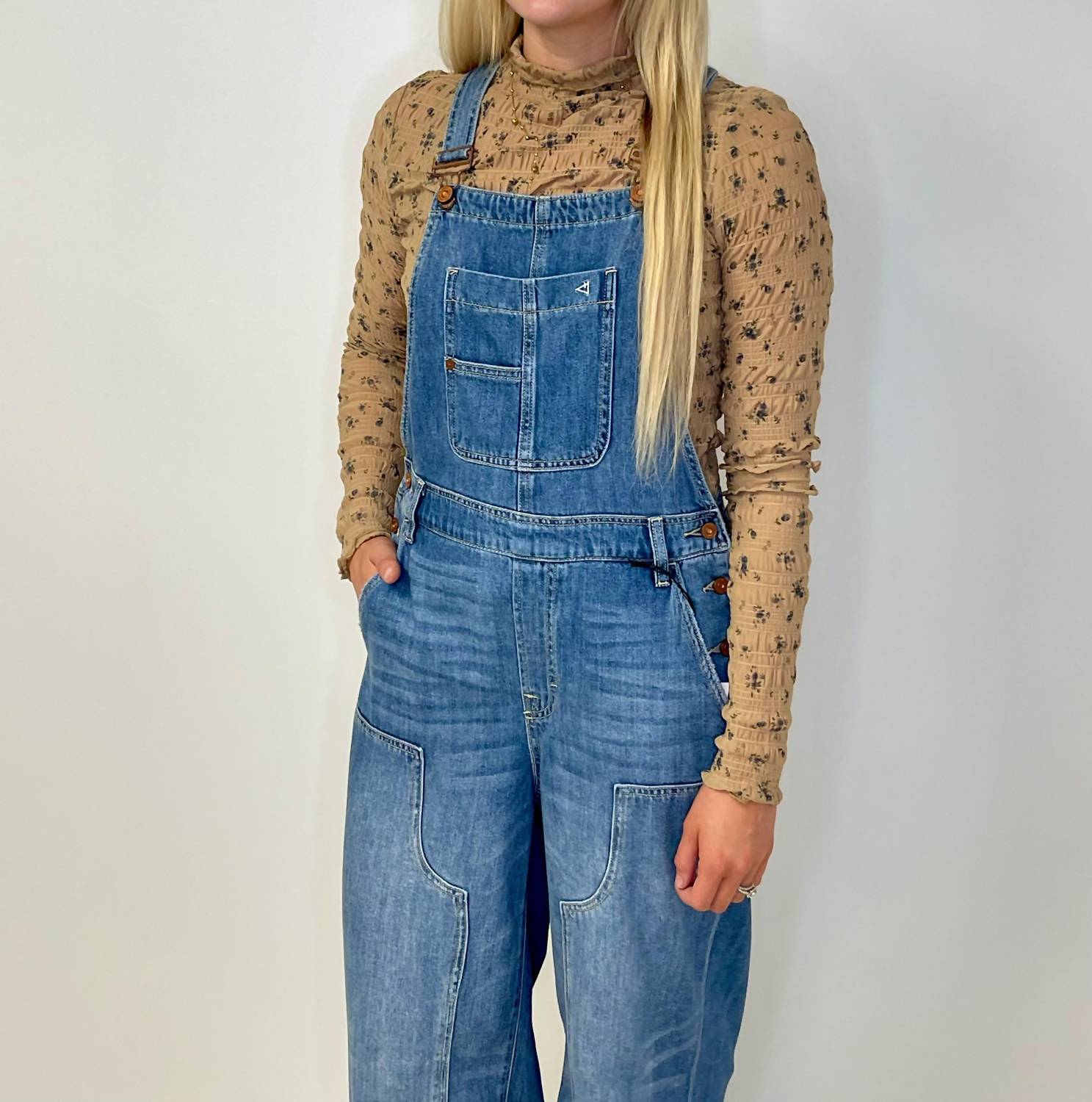 Wear these overalls any season by layering your favorite tank top or turtleneck underneath. Introducing the Dylan Super Soft Western Overalls by HIDDEN, a must-have for your denim collection. These overalls offer a high-rise relaxed fit, featuring a modern western vibe in a medium wash. Made from 73% cotton and 27% rayon, they ensure both comfort and durability, complete with a button closure. Care: Machine wash cold. With a 30" inseam, this piece is perfect for women who appreciate style and comfort. Sierra, standing at 5'4", wears an XS, showcasing the versatile design of these overalls.