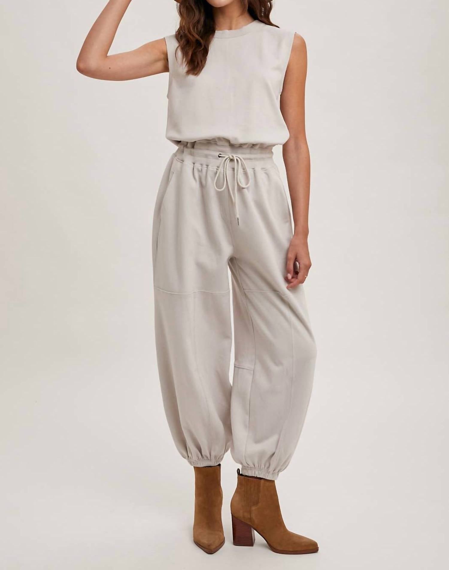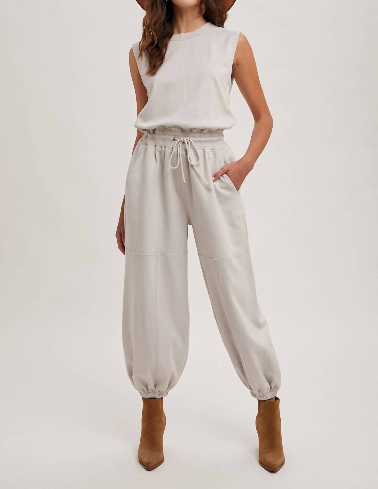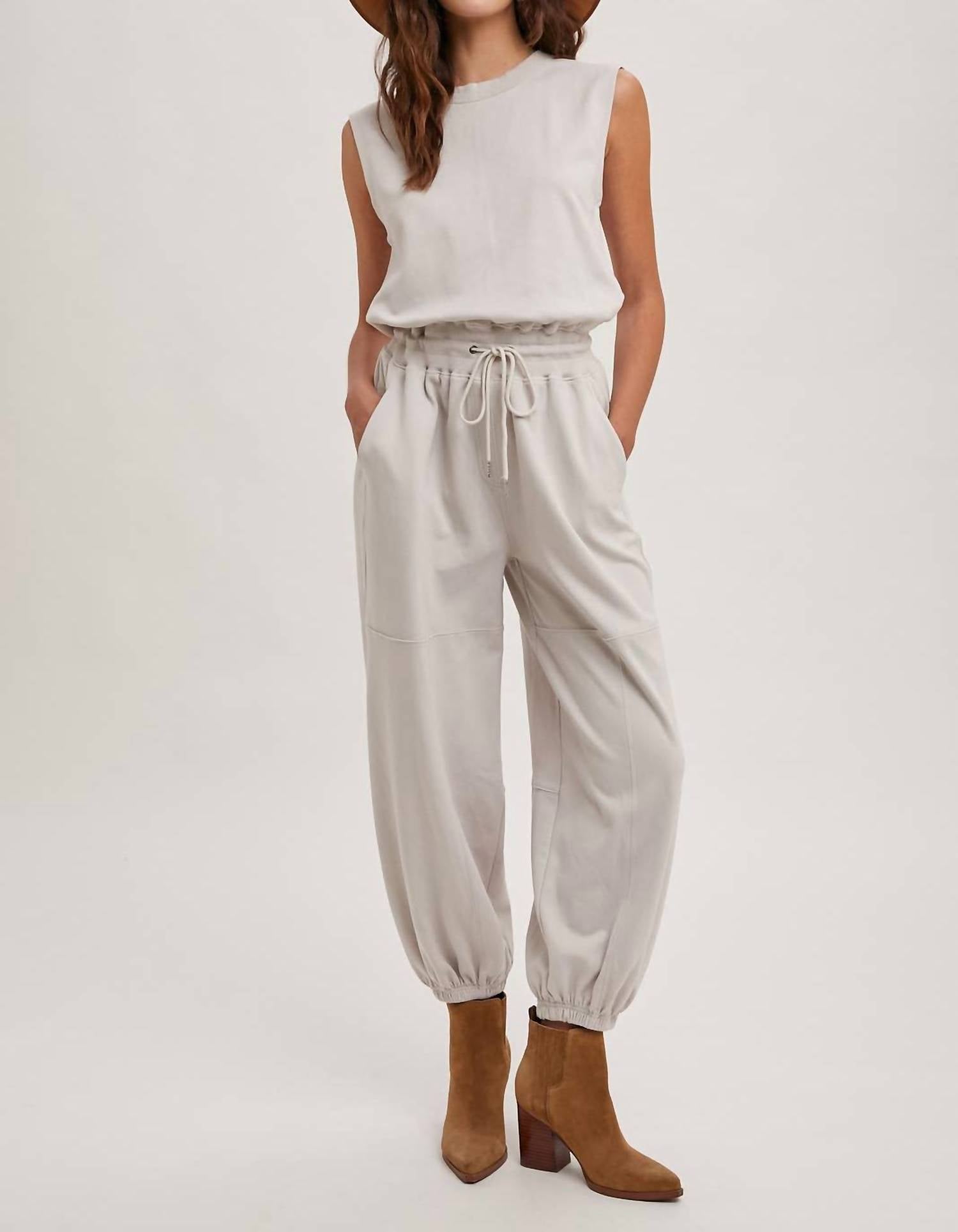 Introducing the Jumpin Into Spring Athleisure Jumpsuit by BluIvy, an essential for your casual and active wardrobe. This tan sleeveless jumpsuit features a relaxed silhouette and a drawstring waist for a customizable fit, complete with convenient pockets. Crafted from a soft and breathable cotton blend composed of 65% cotton and 35% polyester. Closure: Button closure. Perfect for travel during the Spring season, this piece promises comfort and style wherever you go.