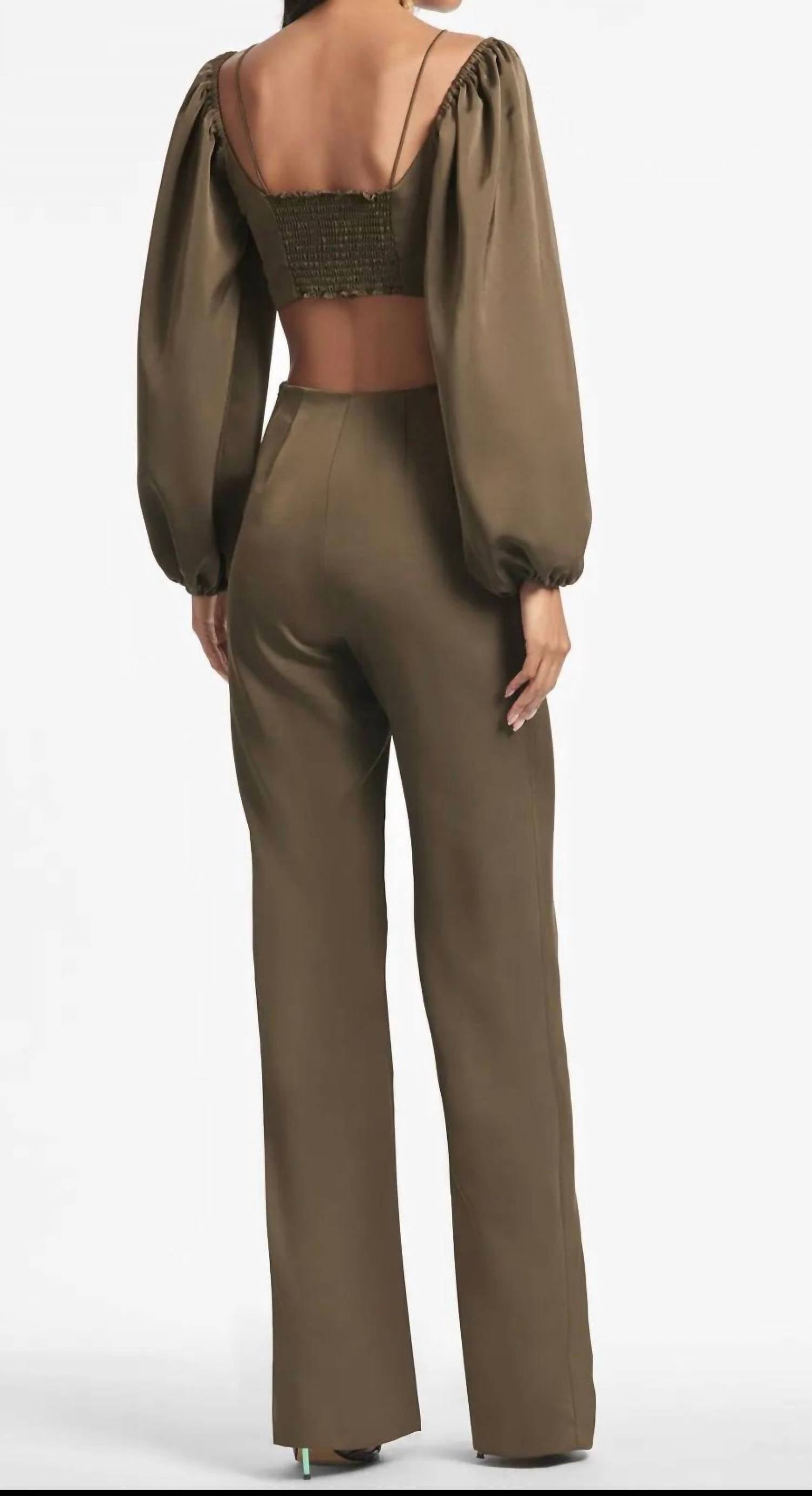 Discover the elegant Bruni Jumpsuit by SACHIN & BABI, a stunning choice for evening events in a sophisticated olive hue. Featuring long sleeves and a flattering V-neckline, this minimalist pantsuit is crafted from smooth satin crepe and made from 100% polyester. Its wide leg and high-rise waist provide a regular fit, complete with a side zipper closure for seamless elegance. Imported with a 31" inseam, this solid pattern jumpsuit is perfect for adding a touch of sophistication to your fall wardrobe.