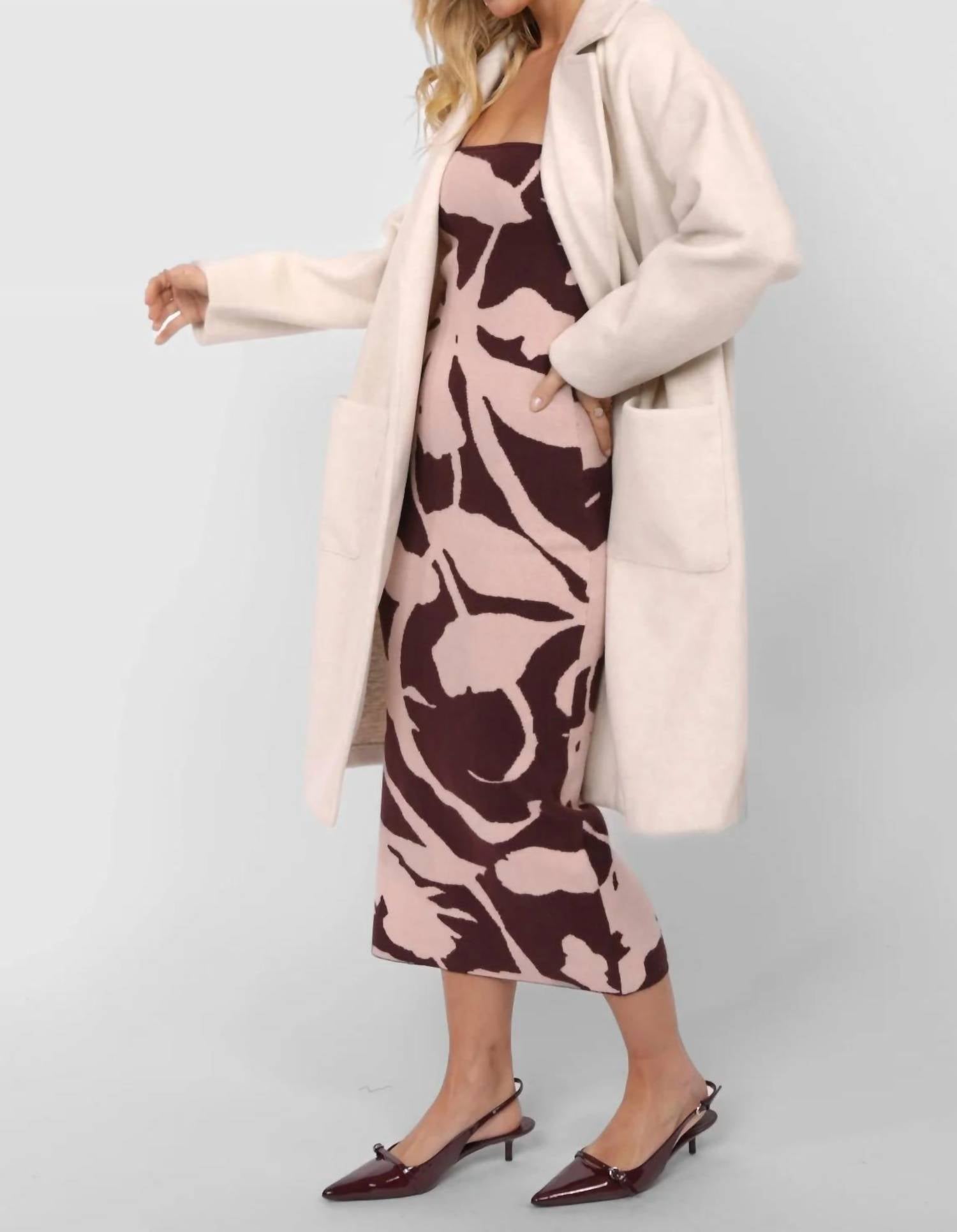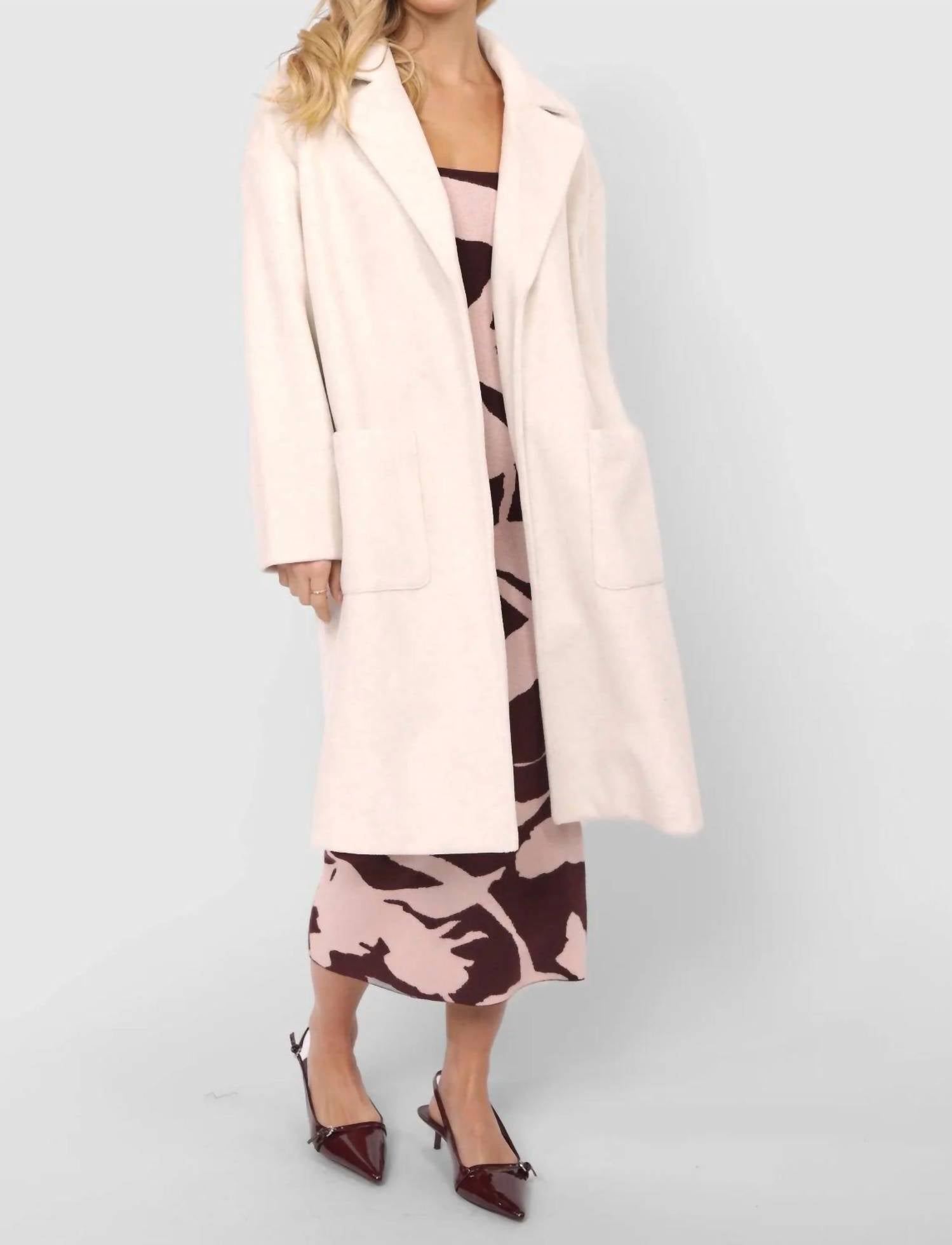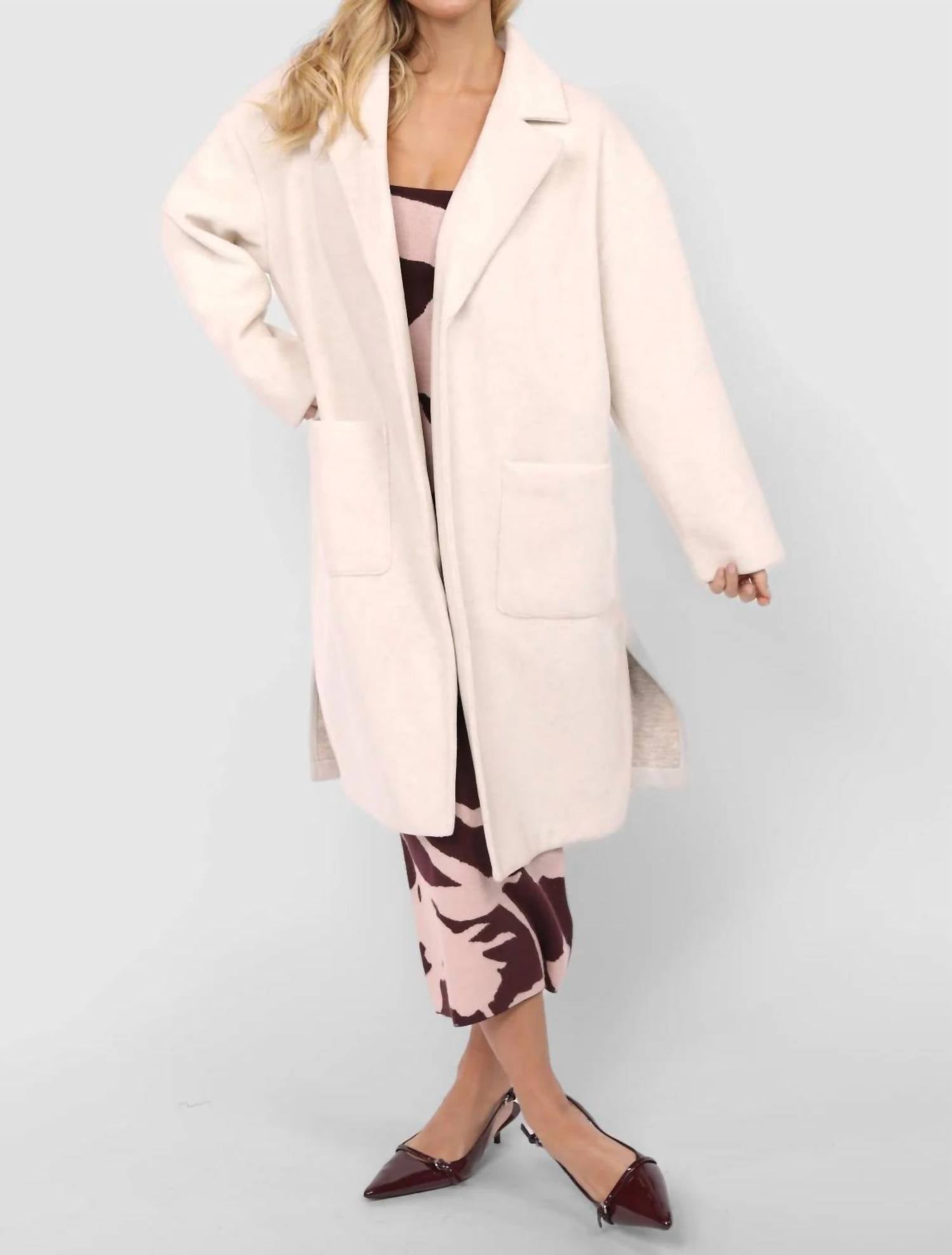 Everyone needs a classic pea coat in their closet and this version might just be our favorite. Embrace understated elegance with the Out Of Town Open Front Long Coat by Sadie & Sage, crafted for minimalist charm in a cream shade. This long-sleeve coat is composed of 100% polyester with a soft, felt-like texture and beautiful side slits and pockets for practicality. The open front and collared neckline make for a relaxed yet sophisticated silhouette. Designed without stretch, it is lined for added comfort and requires dry cleaning to maintain its pristine condition. Model is 5'8" with measurements of 29" bust, 28" waist, 35" hip, wearing size XS.