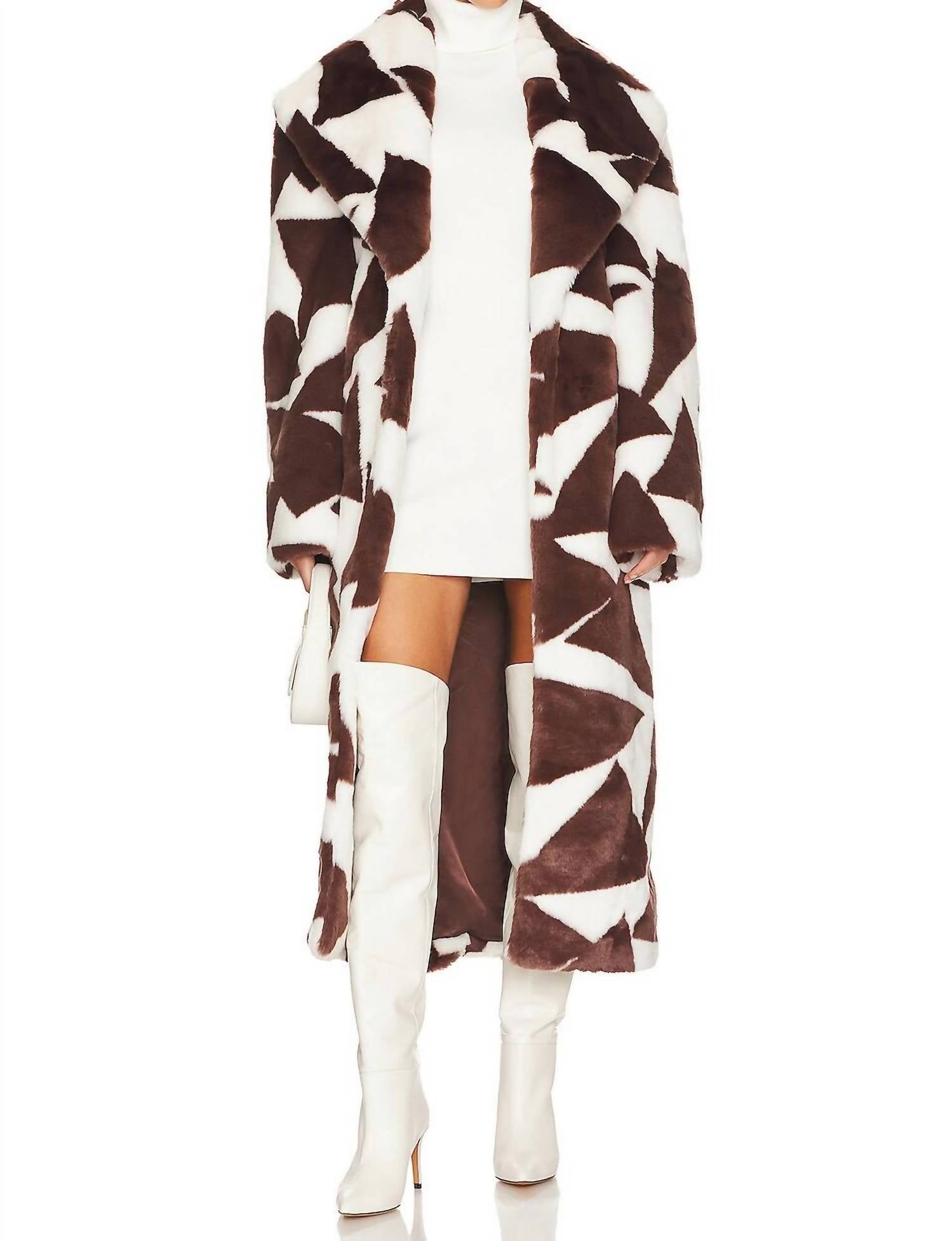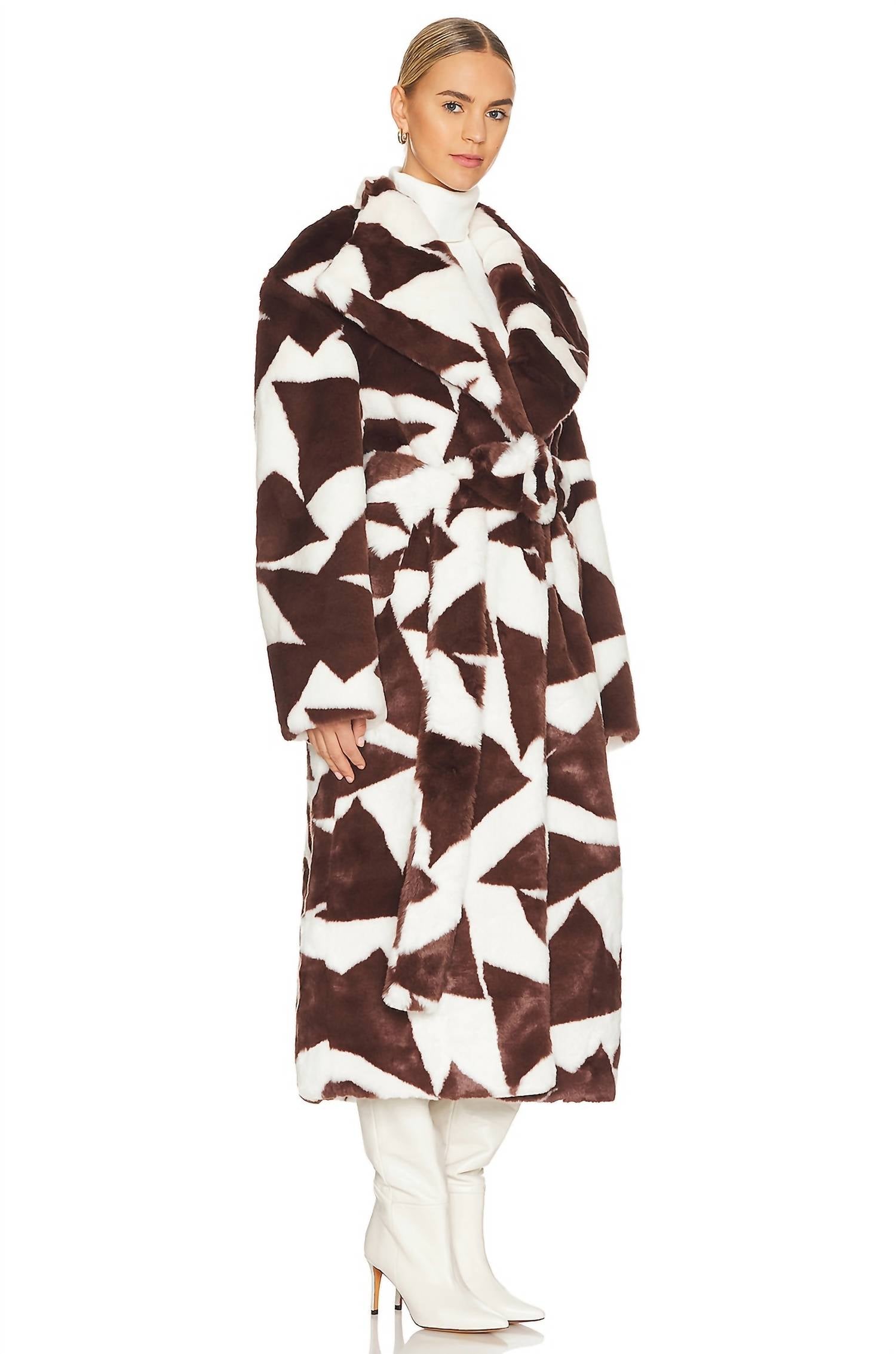 Everyone needs a classic pea coat in their closet and this version might just be our favorite. Introducing the Ilia Faux Fur Coat by RONNY KOBO, a striking addition to any wardrobe with its patterned design. This long sleeve fur coat is crafted from quality 80% acrylic, 20% polyester and features a stylish collar and lined interior for added warmth. The coat has convenient pockets and a chic tie closure, making it both fashionable and functional. Designed in India, it requires dry cleaning and should be line dried to maintain its luxurious feel.