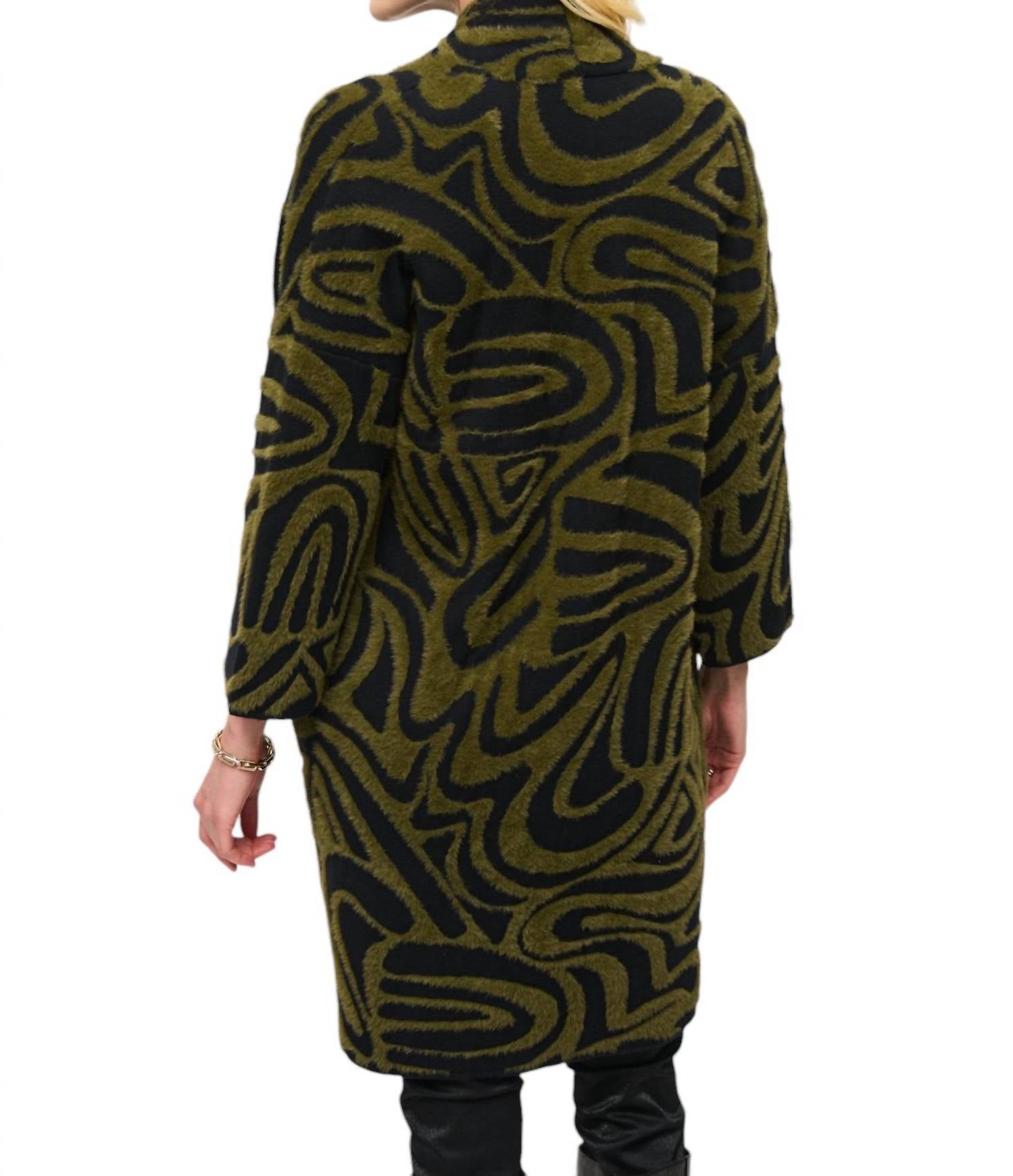 Introducing the Long Coat by Joseph Ribkoff, designed in a chic olive and black palette, offering an exquisite blend of timeless elegance and relaxed sophistication. Featuring long straight sleeves and crafted from 60% Polyamide, 25% Viscose Rayon, and 15% Polyester, this collarless, thigh-length cardigan showcases an abstract pattern for a chic, casual style. Length: 38 inches (97 cm), this oversized fit piece has an open front closure, front pockets, and is unlined for ultimate comfort. Care instructions: Hand wash in cold water and lay flat to dry.